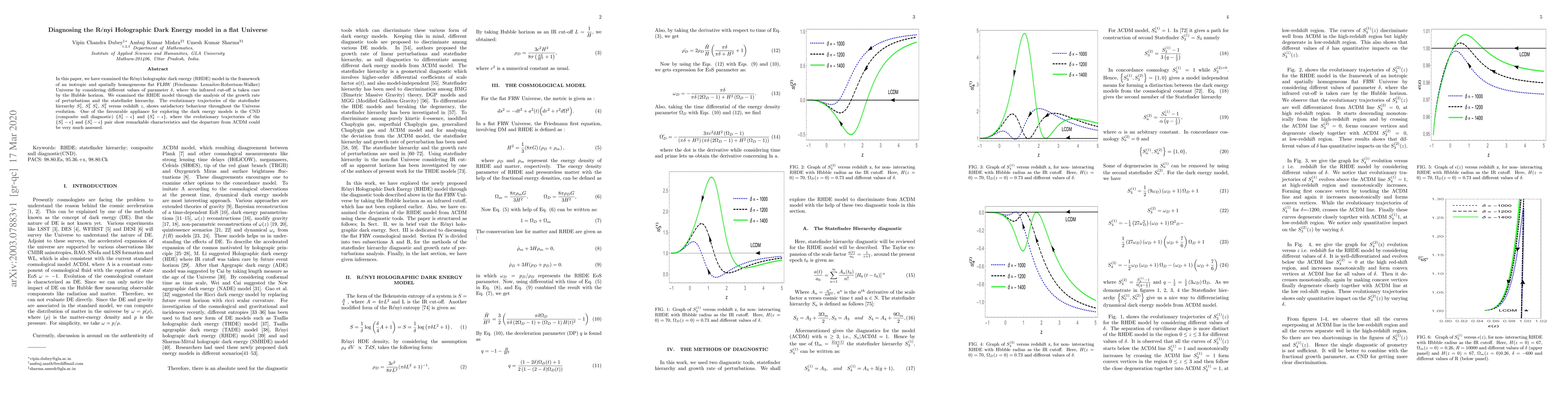 In this paper, we have examined the R$\acute{e}$nyi holographic dark energy (RHDE) model in the framework of an isotropic and spatially homogeneous flat FLRW (Friedmann- Lema$\hat i$tre-Robertson-Walker) Universe by considering different values of parameter $\delta$, where the infrared cut-off is taken care by the Hubble horizon. We examined the RHDE model through the analysis of the growth rate of perturbations and the statefinder hierarchy. The evolutionary trajectories of the statefinder hierarchy $S_3^1$, $S_3^2$ $S_4^1$, $S_4^2$ versus redshift $z$, shows satisfactory behaviour throughout the Universe evolution. One of the favourable appliance for exploring the dark energy models is the CND (composite null diagnostic) $\{ S_3^1 - \epsilon\}$ and $\{ S_4^1 - \epsilon\}$, where the evolutionary trajectories of the $\{ S_3^1 - \epsilon\}$ and $\{ S_4^1 - \epsilon\}$ pair show remarkable characteristics and the departure from $\Lambda$CDM could be very much assessed.