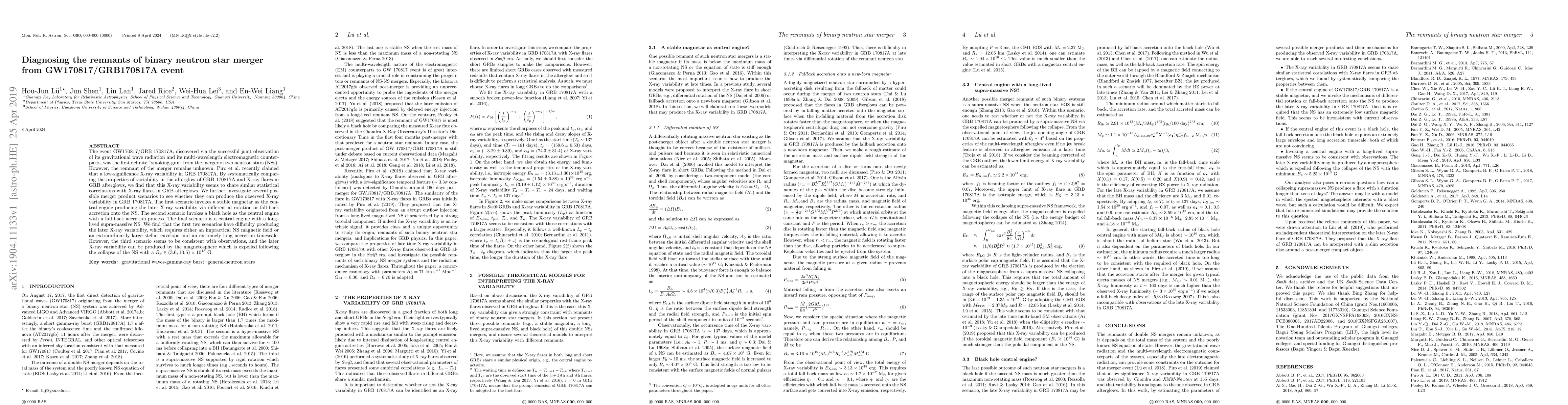 The event GW170817/GRB 170817A, discovered via the successful joint observation of its gravitational wave radiation and its multi-wavelength electromagnetic counterparts, was the first definite "smoking-gun" from the merger of two neutron stars (NSs). However, the remnant of the merger remains unknown. Piro et al. recently claimed that a low-significance X-ray variability in GRB 170817A. By systematically comparing the properties of variability in the afterglow of GRB 170817A and X-ray flares in GRB afterglows, we find that this X-ray variability seems to share similar statistical correlations with X-ray flares in GRB afterglows. We further investigate several possible merger product scenarios to see whether they can produce the observed X-ray variability in GRB 170817A. The first scenario invokes a stable magnetar as the central engine producing the later X-ray variability via differential rotation or fall-back accretion onto the NS. The second scenario invokes a black hole as the central engine with a fall-back accretion process. The final scenario is a central engine with a long-lived supra-massive NS. We find that the first two scenarios have difficulty producing the later X-ray variability, which requires either an impractical NS magnetic field or an extraordinarily large stellar envelope and an extremely long accretion timescale. However, the third scenario seems to be consistent with observations, and the later X-ray variability can be produced by the magnetosphere which is expelled following the collapse of the NS with a $B_p\in(3.6, 13.5)\times10^{13}$ G.