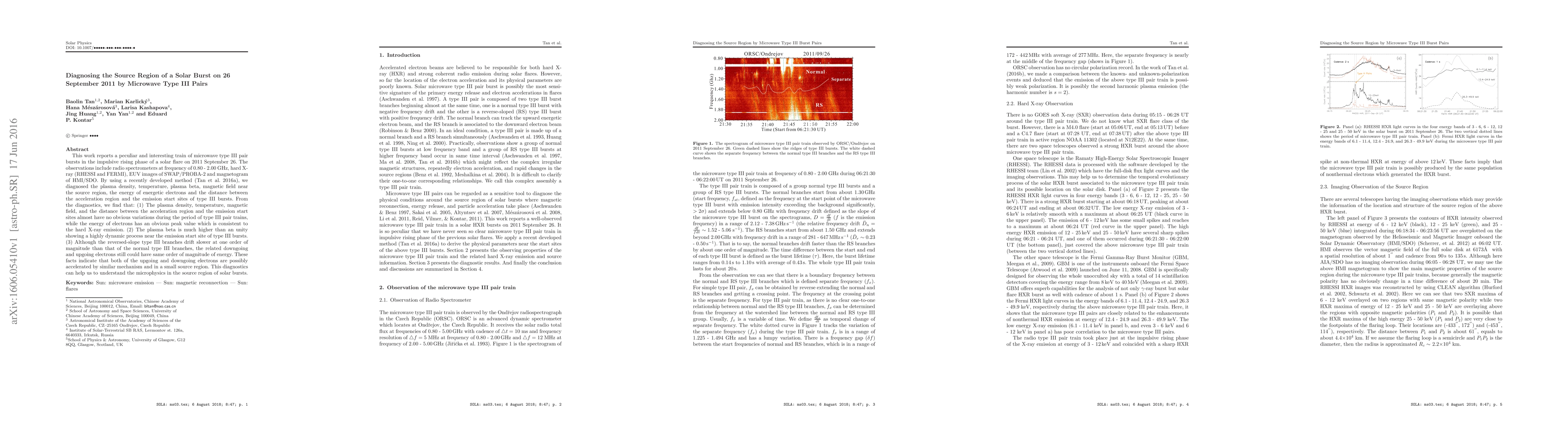 This work reports a peculiar and interesting train of microwave type III pair bursts in the impulsive rising phase of a solar flare on 2011 September 26. The observations include radio spectrometers at frequency of 0.80 - 2.00 GHz, hard X-ray (RHESSI and FERMI), EUV images of SWAP/PROBA-2 and magnetogram of HMI/SDO. By using a recently developed method (Tan et al. 2016a), we diagnosed the plasma density, temperature, plasma beta, magnetic field near the source region, the energy of energetic electrons and the distance between the acceleration region and the emission start sites of type III bursts. From the diagnostics, we find that: (1) The plasma density, temperature, magnetic field, and the distance between the acceleration region and the emission start sites almost have no obvious variations during the period of type III pair trains, while the energy of electrons has an obvious peak value which is consistent to the hard X-ray emission. (2) The plasma beta is much higher than an unity showing a highly dynamic process near the emission start site of type III bursts. (3) Although the reversed-slope type III branches drift slower at one order of magnitude than that of the normal type III branches, the related downgoing and upgoing electrons still could have same order of magnitude of energy. These facts indicate that both of the upgoing and downgoing electrons are possibly accelerated by similar mechanism and in a small source region. This diagnostics can help us to understand the microphysics in the source region of solar bursts.