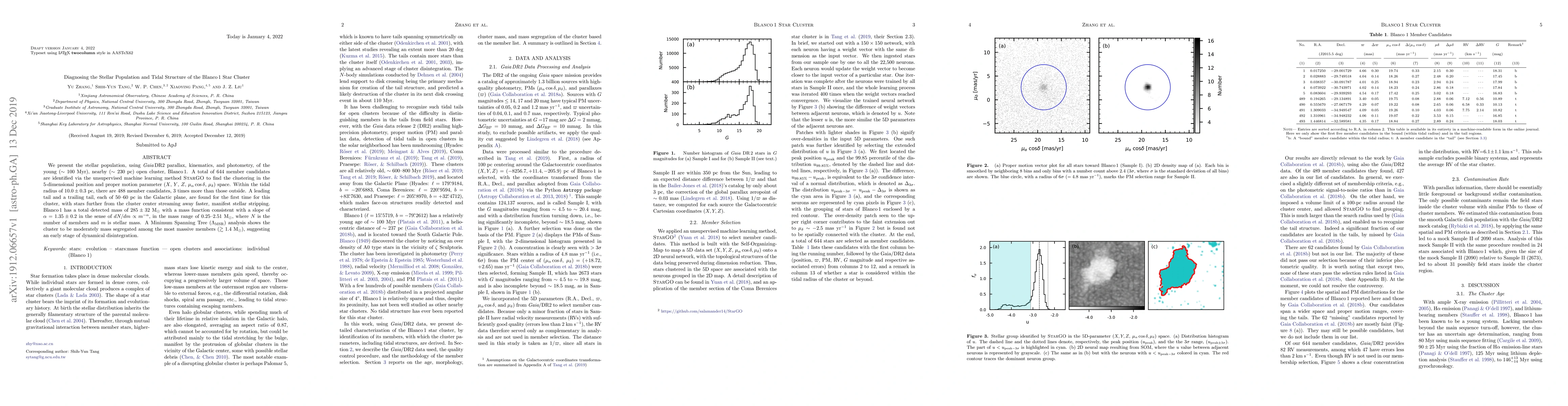 We present the stellar population, using {\it Gaia}\,DR2 parallax, kinematics, and photometry, of the young ($\sim 100$~Myr), nearby ($\sim 230$~pc) open cluster, Blanco1. A total of 644 member candidates are identified via the unsupervised machine learning method \textsc{StarGO} to find the clustering in the 5-dimensional position and proper motion parameter ($X$, $Y$, $Z$, $\mu_\alpha \cos\delta$, $\mu_\delta$) space. Within the tidal radius of $10.0 \pm 0.3$~pc, there are 488 member candidates, 3 times more than those outside. A leading tail and a trailing tail, each of 50--60~pc in the Galactic plane, are found for the first time for this cluster, with stars further from the cluster center streaming away faster, manifest stellar stripping. Blanco1 has a total detected mass of $285\pm32$~M$_\odot $ with a mass function consistent with a slope of $\alpha=1.35\pm0.2$ in the sense of $dN/dm \propto m^{-\alpha}$, in the mass range of 0.25--2.51~M$_\odot $, where $N$ is the number of members and $m$ is stellar mass. A Minimum Spanning Tree ($\Lambda_{\rm MSR}$) analysis shows the cluster to be moderately mass segregated among the most massive members ($\gtrsim 1.4$~M$_\odot$), suggesting an early stage of dynamical disintegration.