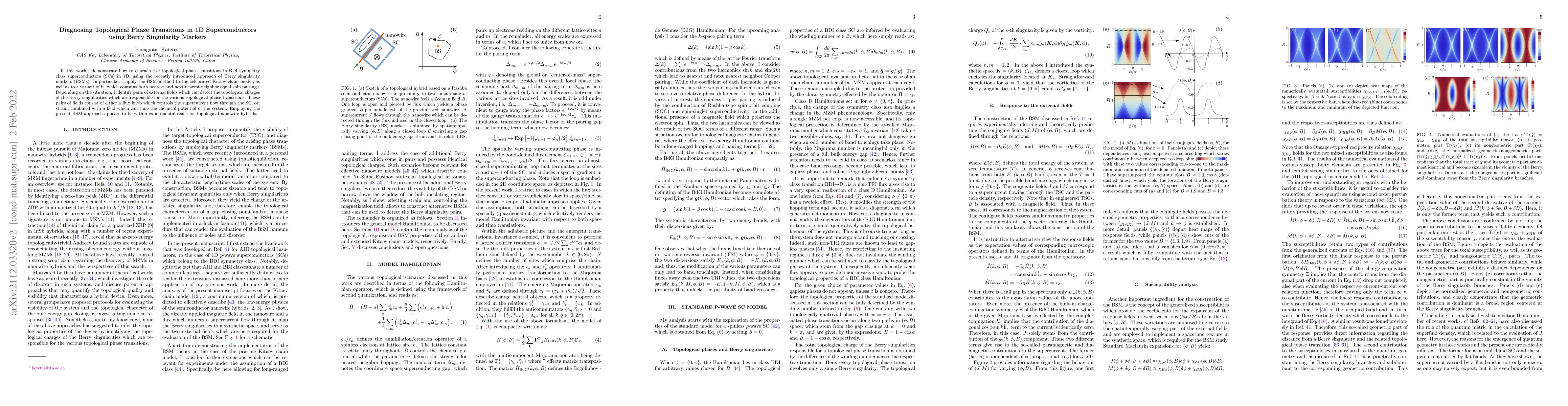 This paper demonstrates the use of Berry singularity markers (BSMs) to characterize topological phase transitions in 1D BDI class superconductors, specifically applying the method to the Kitaev chain model and its variant with mixed spin pairings. The study identifies external field pairs, such as flux or strain, to detect topological charges, suggesting a feasible experimental approach for topological nanowire hybrids.