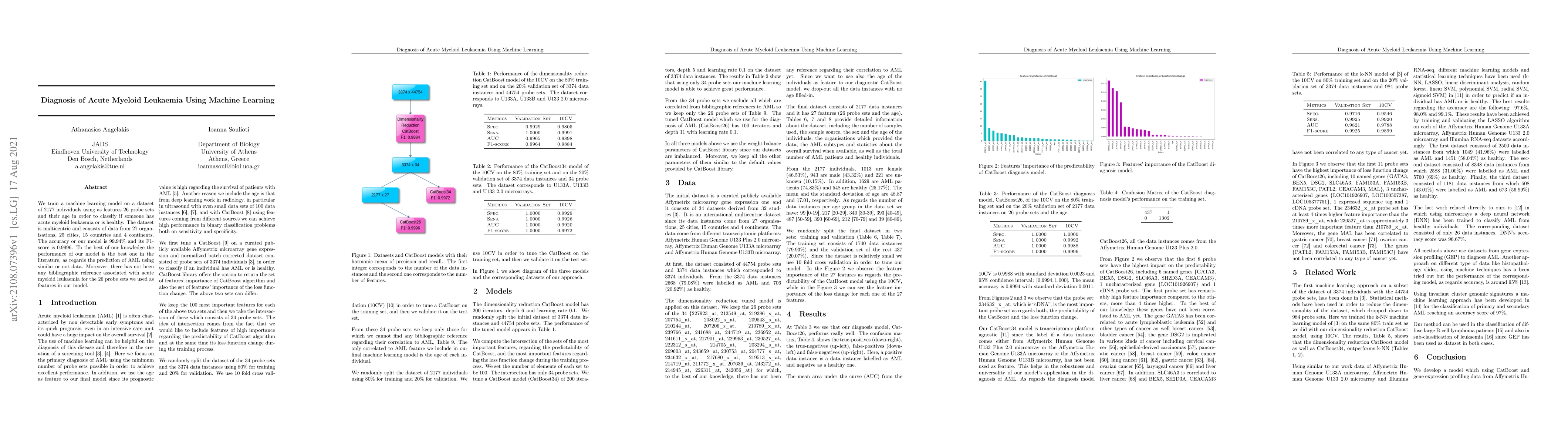 This study trains a machine learning model to diagnose acute myeloid leukaemia (AML) using 26 probe sets and age as features, achieving 99.94% accuracy and a 0.9996 F1-score. The model's performance is claimed to be the best in literature for AML prediction.