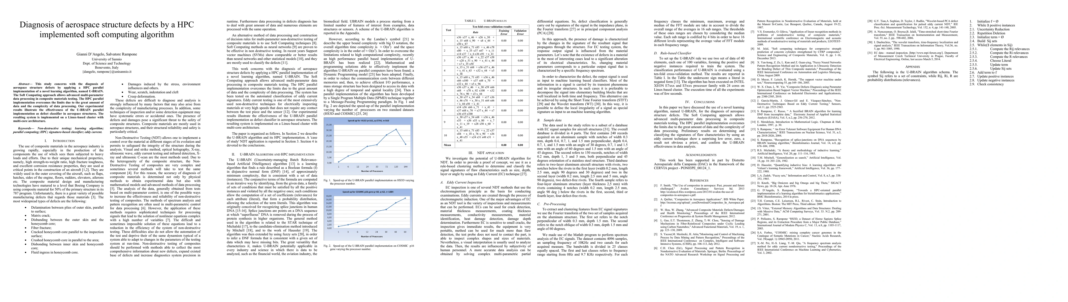 This study concerns with the diagnosis of aerospace structure defects by applying a HPC parallel implementation of a novel learning algorithm, named U-BRAIN. The Soft Computing approach allows advanced multi-parameter data processing in composite materials testing. The HPC parallel implementation overcomes the limits due to the great amount of data and the complexity of data processing. Our experimental results illustrate the effectiveness of the U-BRAIN parallel implementation as defect classifier in aerospace structures. The resulting system is implemented on a Linux-based cluster with multi-core architecture.