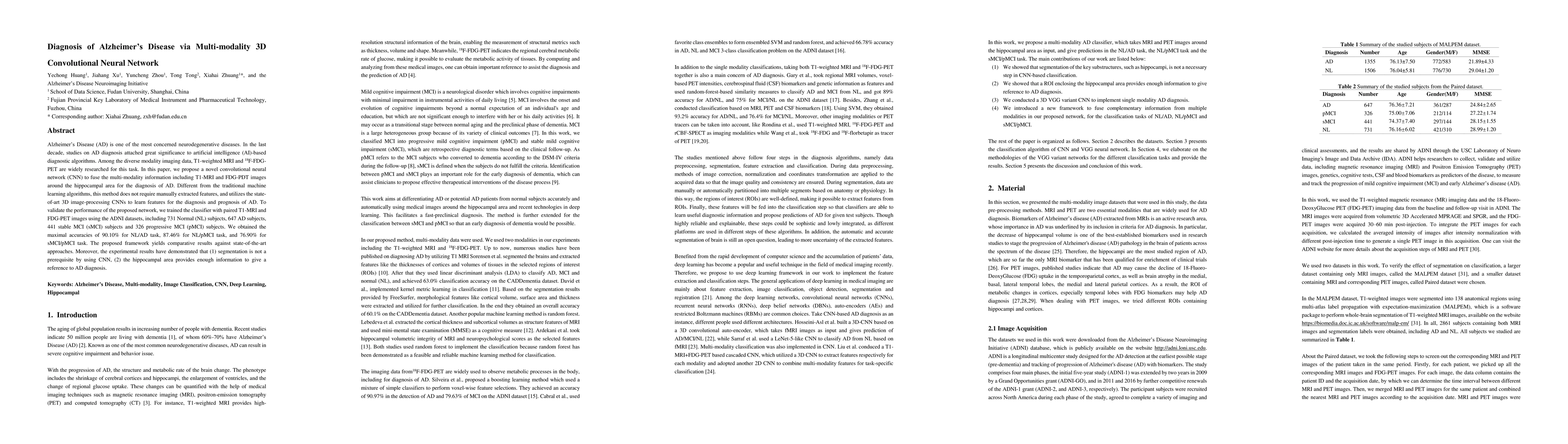 Alzheimer's Disease (AD) is one of the most concerned neurodegenerative diseases. In the last decade, studies on AD diagnosis attached great significance to artificial intelligence (AI)-based diagnostic algorithms. Among the diverse modality imaging data, T1-weighted MRI and 18F-FDGPET are widely researched for this task. In this paper, we propose a novel convolutional neural network (CNN) to fuse the multi-modality information including T1-MRI and FDG-PDT images around the hippocampal area for the diagnosis of AD. Different from the traditional machine learning algorithms, this method does not require manually extracted features, and utilizes the stateof-art 3D image-processing CNNs to learn features for the diagnosis and prognosis of AD. To validate the performance of the proposed network, we trained the classifier with paired T1-MRI and FDG-PET images using the ADNI datasets, including 731 Normal (NL) subjects, 647 AD subjects, 441 stable MCI (sMCI) subjects and 326 progressive MCI (pMCI) subjects. We obtained the maximal accuracies of 90.10% for NL/AD task, 87.46% for NL/pMCI task, and 76.90% for sMCI/pMCI task. The proposed framework yields comparative results against state-of-the-art approaches. Moreover, the experimental results have demonstrated that (1) segmentation is not a prerequisite by using CNN, (2) the hippocampal area provides enough information to give a reference to AD diagnosis. Keywords: Alzheimer's Disease, Multi-modality, Image Classification, CNN, Deep Learning, Hippocampal