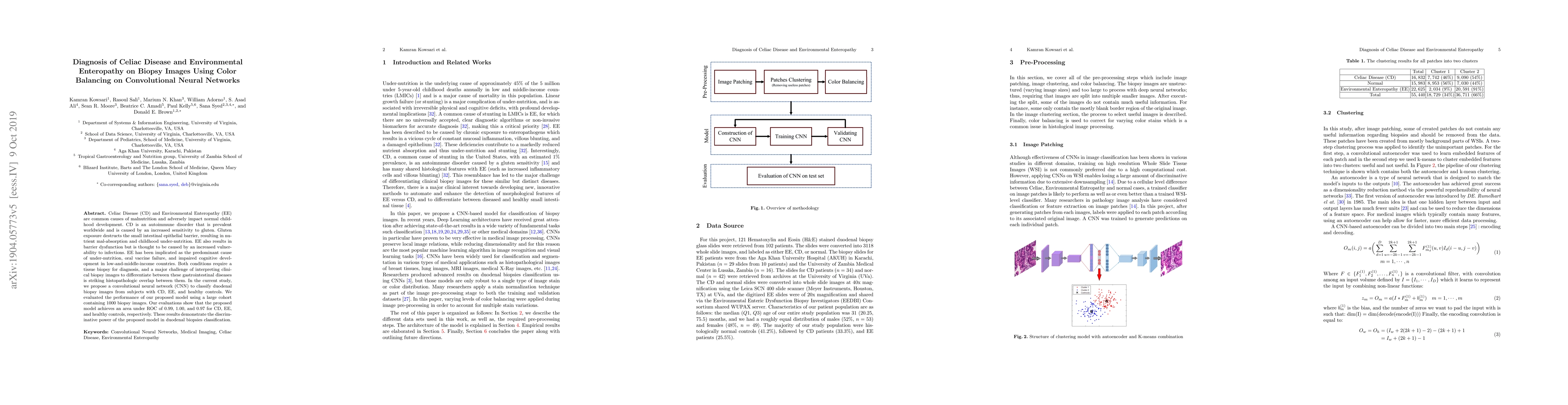 This study proposes a convolutional neural network (CNN) to classify duodenal biopsy images for diagnosing Celiac Disease and Environmental Enteropathy, achieving high accuracy with an area under ROC of 0.99, 1.00, and 0.97 for CD, EE, and healthy controls respectively. The model demonstrates significant potential in differentiating between these gastrointestinal diseases.