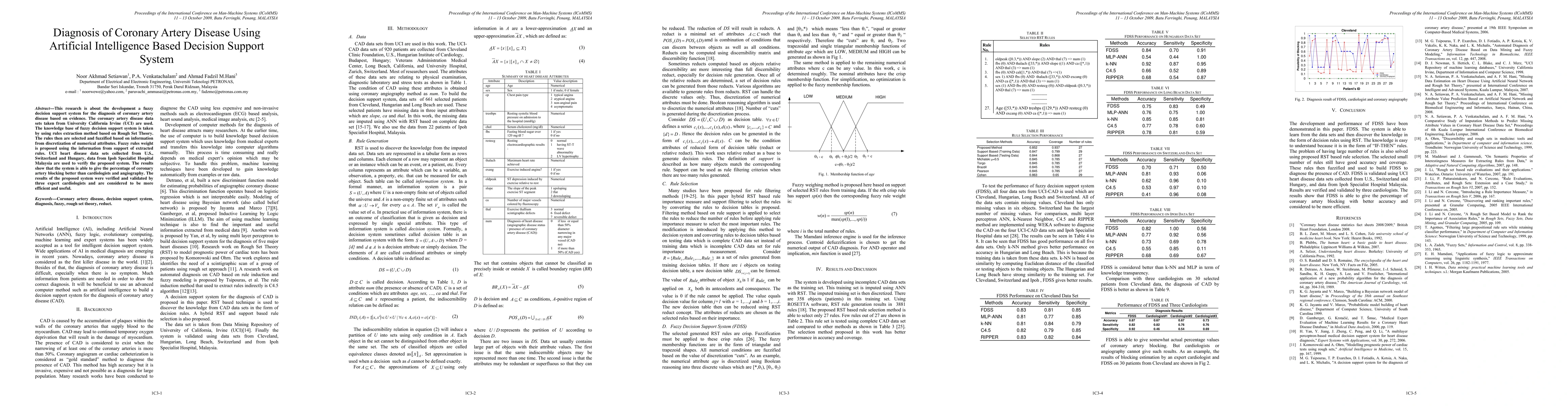 This research develops an AI-based fuzzy decision support system for diagnosing coronary artery disease using data from multiple sources, including the UCI repository. The system's knowledge base is derived from rules extracted via Rough Set Theory and validated by expert cardiologists, showing superior diagnostic accuracy compared to traditional methods.