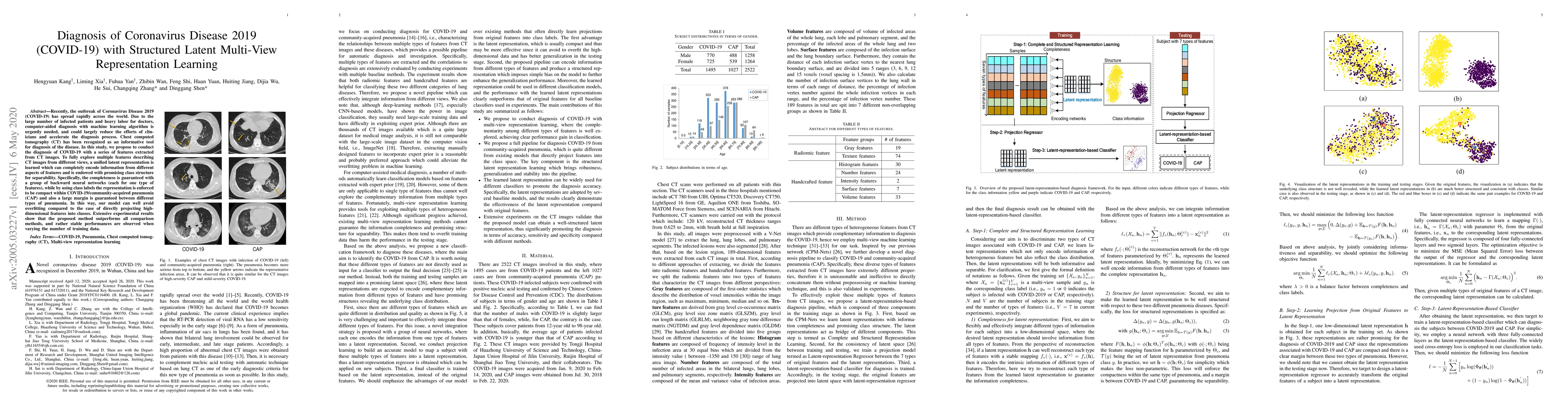 Recently, the outbreak of Coronavirus Disease 2019 (COVID-19) has spread rapidly across the world. Due to the large number of affected patients and heavy labor for doctors, computer-aided diagnosis with machine learning algorithm is urgently needed, and could largely reduce the efforts of clinicians and accelerate the diagnosis process. Chest computed tomography (CT) has been recognized as an informative tool for diagnosis of the disease. In this study, we propose to conduct the diagnosis of COVID-19 with a series of features extracted from CT images. To fully explore multiple features describing CT images from different views, a unified latent representation is learned which can completely encode information from different aspects of features and is endowed with promising class structure for separability. Specifically, the completeness is guaranteed with a group of backward neural networks (each for one type of features), while by using class labels the representation is enforced to be compact within COVID-19/community-acquired pneumonia (CAP) and also a large margin is guaranteed between different types of pneumonia. In this way, our model can well avoid overfitting compared to the case of directly projecting highdimensional features into classes. Extensive experimental results show that the proposed method outperforms all comparison methods, and rather stable performances are observed when varying the numbers of training data.