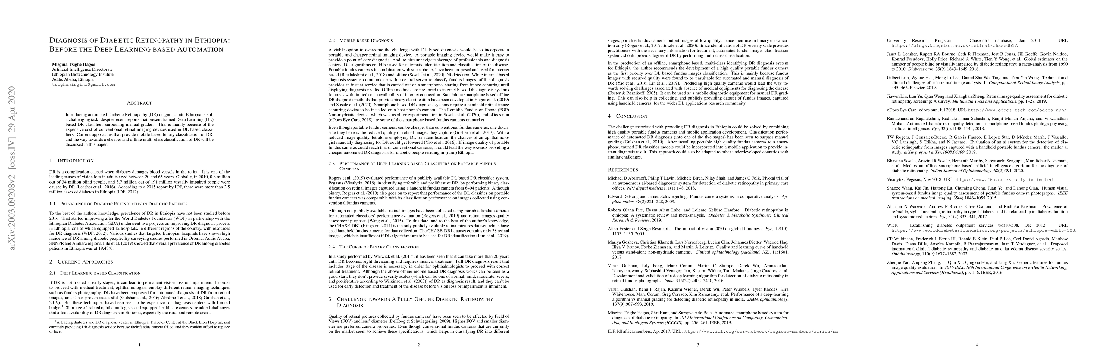 This paper discusses the challenges of introducing automated Diabetic Retinopathy diagnosis in Ethiopia, focusing on the high costs of conventional retinal imaging devices. It explores mobile-based binary classification methods and proposes a cheaper, offline multi-class classification approach.
