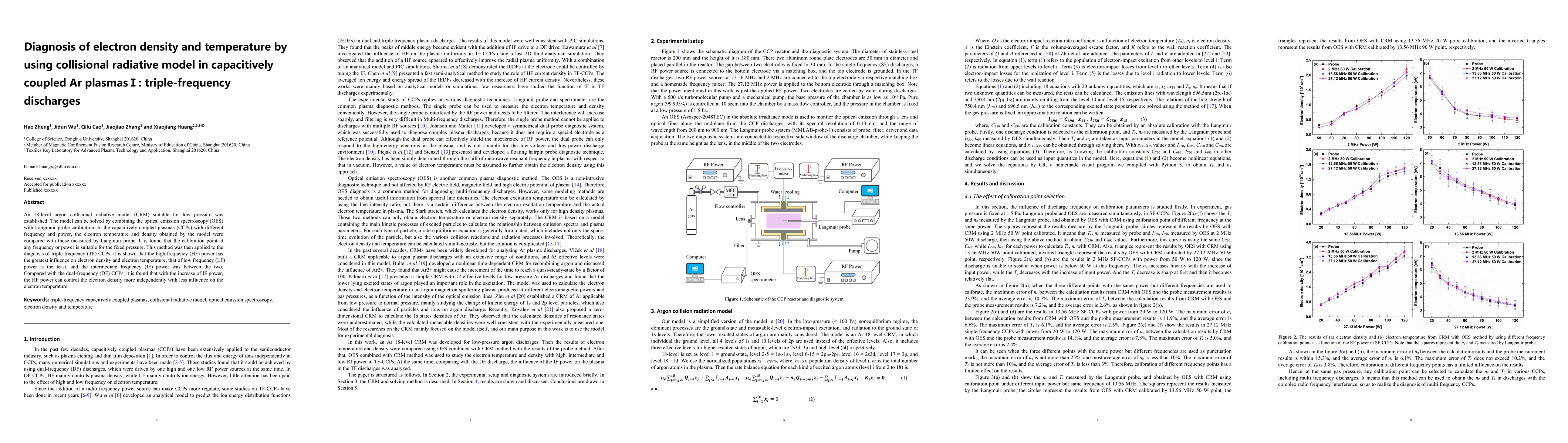 An 18-level argon collisional radiative model (CRM) suitable for low pressure was established. The model can be solved by combining the optical emission spectroscopy (OES) with Langmuir probe calibration. In the capacitively coupled plasmas (CCPs) with different frequency and power, the electron temperature and density obtained by the model were compared with those measured by Langmuir probe. It is found that the calibration point at any frequency or power is suitable for the fixed pressure. This method was then applied to the diagnosis of triple-frequency (TF) CCPs, it is shown that the high frequency (HF) power mainly controls the electron density, the low frequency (LF) power mainly controls the electron temperature, and the intermediate frequency (IF) power was between the two. Compared with the dual-frequency (DF) CCPs, it is found that with the increase of IF power, the HF power can control the electron density more independently with less influence on the electron temperature.