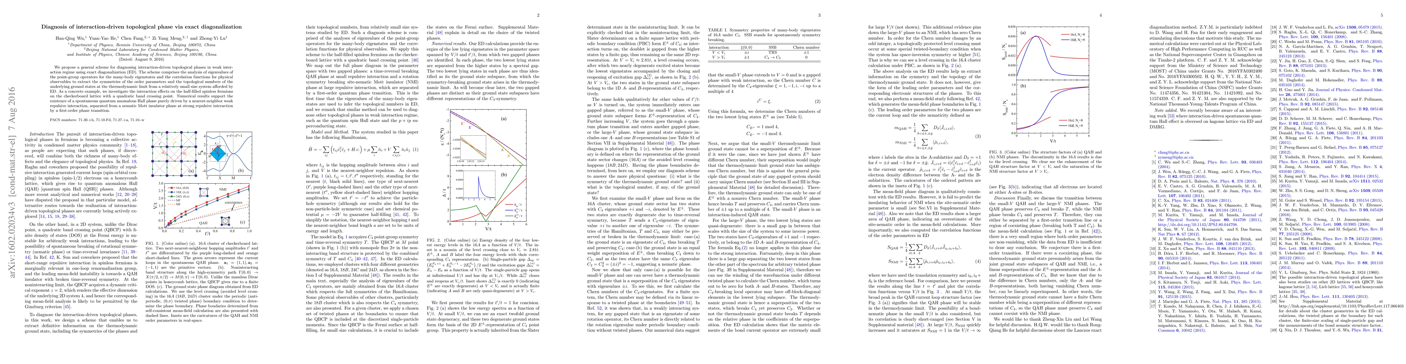 This paper proposes a method for identifying interaction-driven topological phases using exact diagonalization, focusing on the analysis of eigenvalues and correlation functions. It demonstrates the existence of a quantum anomalous Hall phase in spinless fermions on a checkerboard lattice driven by weak interactions.