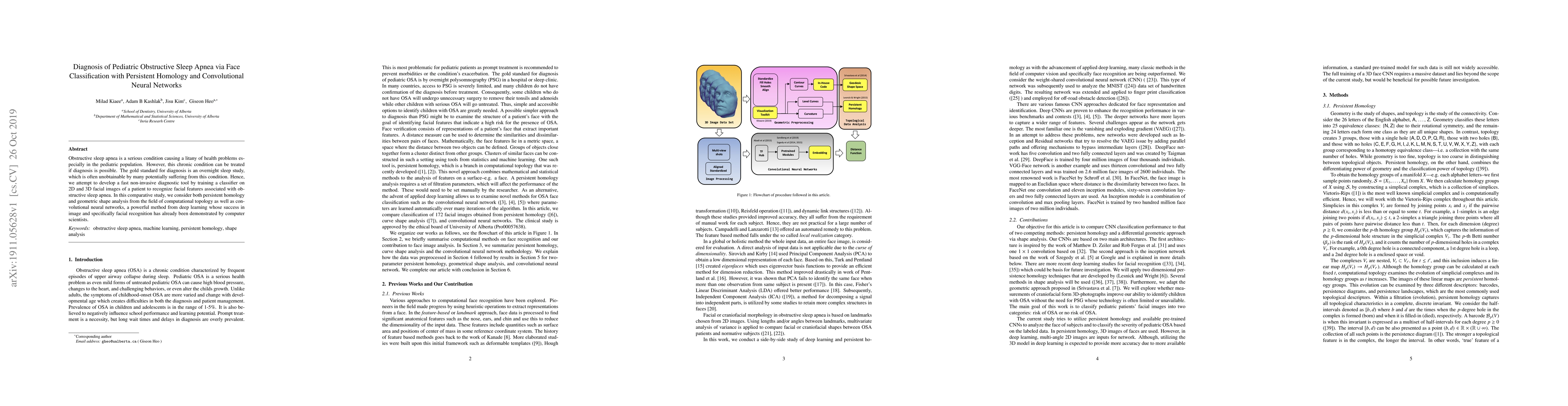 This study proposes a non-invasive diagnostic tool for pediatric obstructive sleep apnea using facial image classification, employing both persistent homology and convolutional neural networks to identify relevant facial features. The aim is to provide a fast alternative to traditional sleep studies, leveraging computational topology and deep learning techniques.