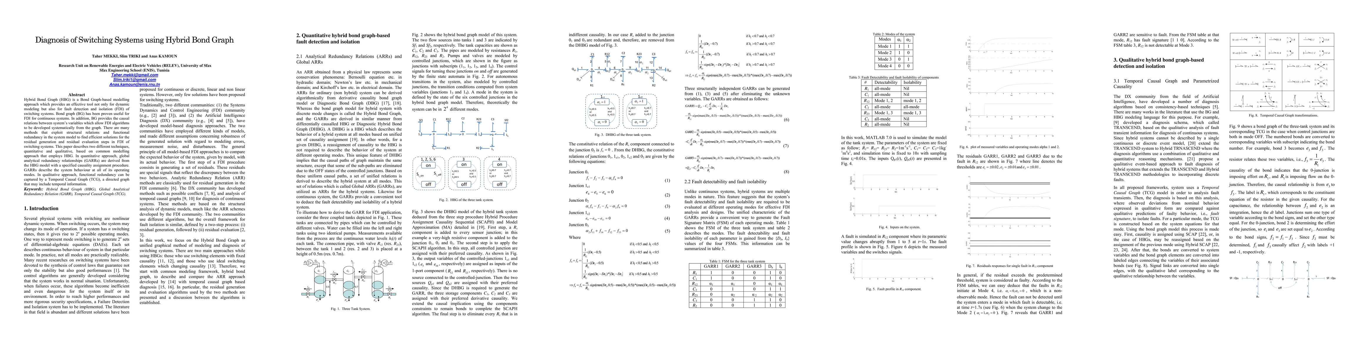 This paper proposes Hybrid Bond Graph (HBG) for diagnosing switching systems, detailing both quantitative and qualitative techniques for fault detection and isolation (FDI). The quantitative approach derives global analytical redundancy relationships (GARRs) from the HBG model, while the qualitative approach uses a Temporal Causal Graph (TCG) to capture functional redundancy.