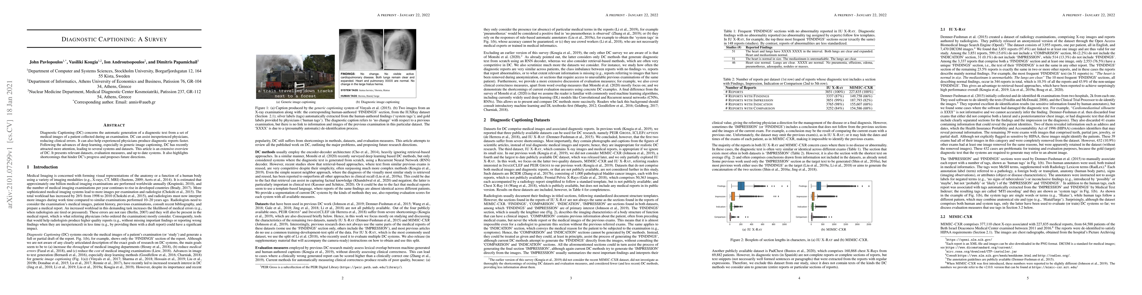 Diagnostic Captioning (DC) concerns the automatic generation of a diagnostic text from a set of medical images of a patient collected during an examination. DC can assist inexperienced physicians, reducing clinical errors. It can also help experienced physicians produce diagnostic reports faster. Following the advances of deep learning, especially in generic image captioning, DC has recently attracted more attention, leading to several systems and datasets. This article is an extensive overview of DC. It presents relevant datasets, evaluation measures, and up to date systems. It also highlights shortcomings that hinder DC's progress and proposes future directions.