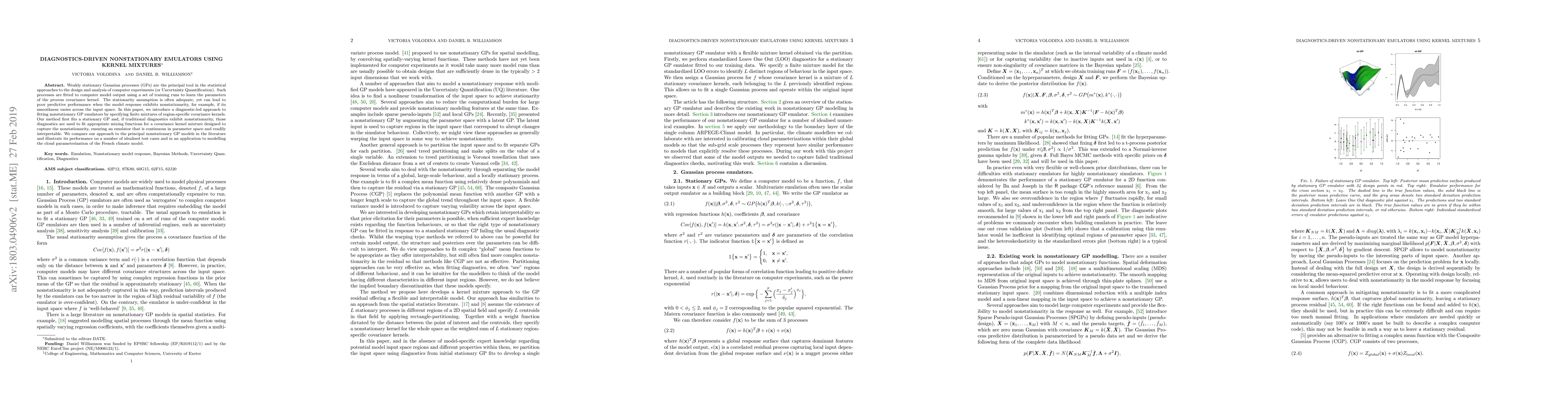 The paper introduces a diagnostic-driven approach to fitting nonstationary Gaussian process (GP) emulators using finite mixtures of region-specific covariance kernels. It first fits a stationary GP and, if diagnostics suggest nonstationarity, uses those diagnostics to fit appropriate mixing functions for a covariance kernel mixture designed to capture the nonstationarity, ensuring continuity and interpretability.