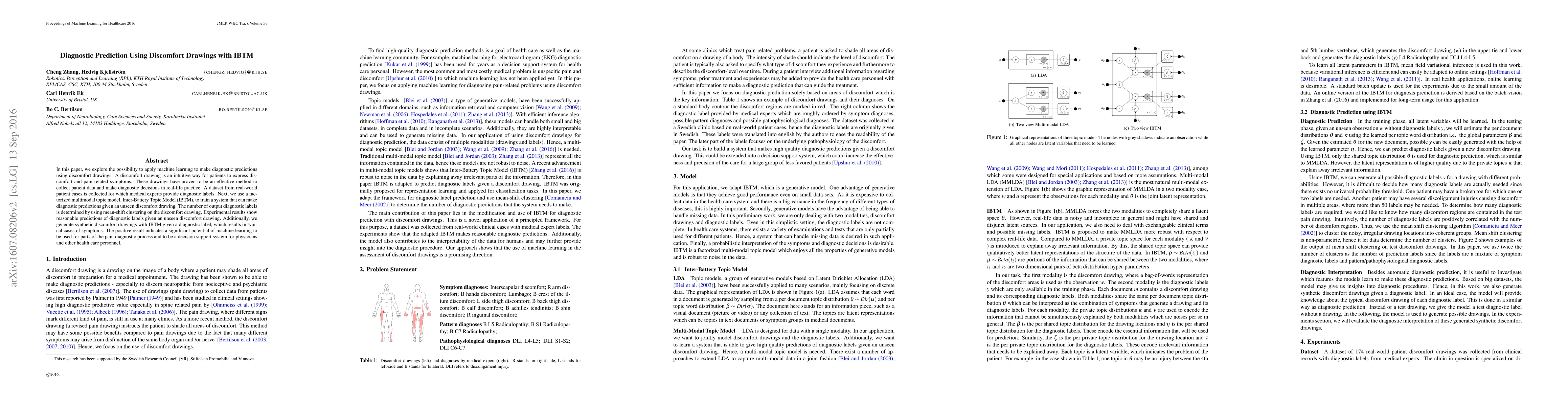 In this paper, we explore the possibility to apply machine learning to make diagnostic predictions using discomfort drawings. A discomfort drawing is an intuitive way for patients to express discomfort and pain related symptoms. These drawings have proven to be an effective method to collect patient data and make diagnostic decisions in real-life practice. A dataset from real-world patient cases is collected for which medical experts provide diagnostic labels. Next, we use a factorized multimodal topic model, Inter-Battery Topic Model (IBTM), to train a system that can make diagnostic predictions given an unseen discomfort drawing. The number of output diagnostic labels is determined by using mean-shift clustering on the discomfort drawing. Experimental results show reasonable predictions of diagnostic labels given an unseen discomfort drawing. Additionally, we generate synthetic discomfort drawings with IBTM given a diagnostic label, which results in typical cases of symptoms. The positive result indicates a significant potential of machine learning to be used for parts of the pain diagnostic process and to be a decision support system for physicians and other health care personnel.