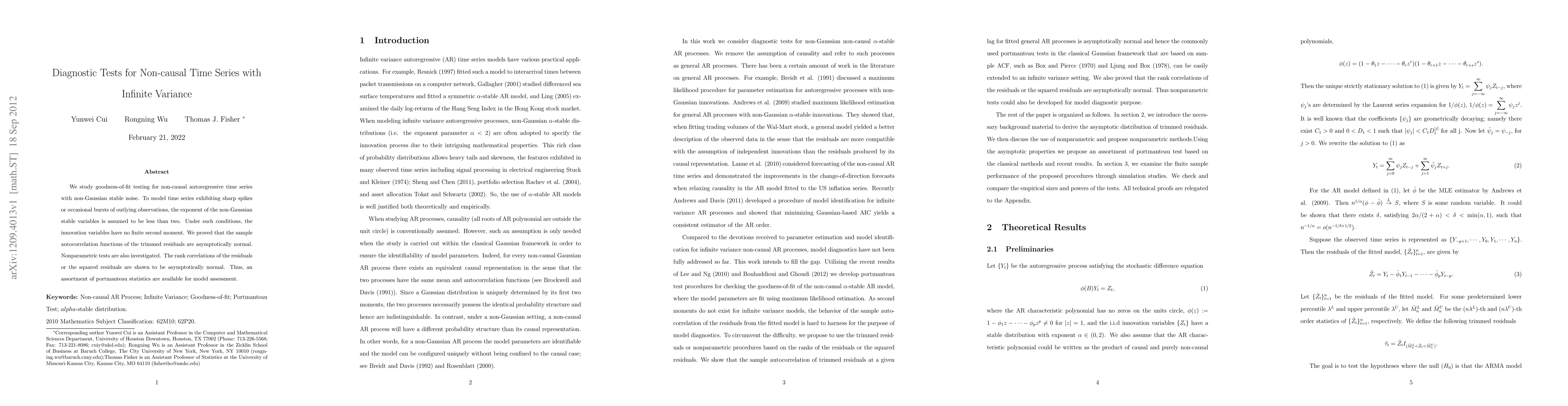 We study goodness-of-fit testing for non-causal autoregressive time series with non-Gaussian stable noise. To model time series exhibiting sharp spikes or occasional bursts of outlying observations, the exponent of the non-Gaussian stable variables is assumed to be less than two. Under such conditions, the innovation variables have no finite second moment. We proved that the sample autocorrelation functions of the trimmed residuals are asymptotically normal. Nonparametric tests are also investigated. The rank correlations of the residuals or the squared residuals are shown to be asymptotically normal. Thus, an assortment of portmanteau statistics are available for model assessment.