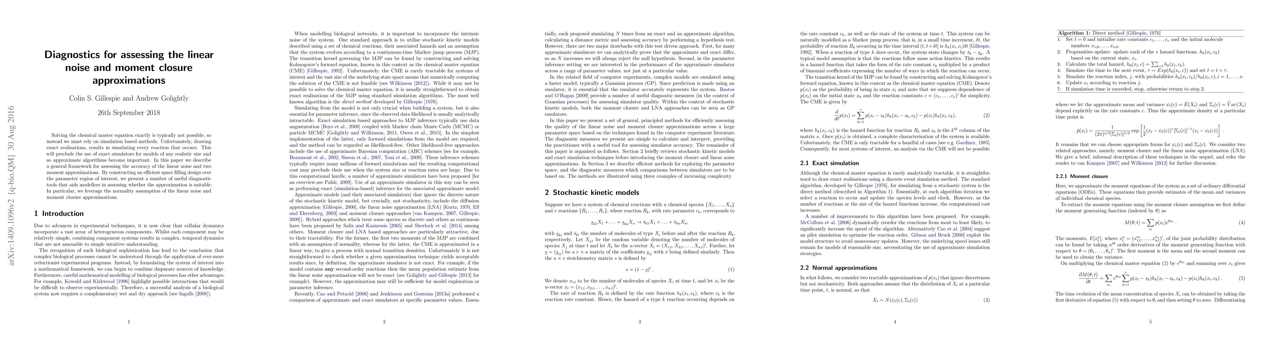 This paper introduces a framework for evaluating the accuracy of linear noise and moment closure approximations in chemical master equation models. It provides diagnostic tools based on space-filling designs and leverages the normality assumption to assess the suitability of these approximations for large models.