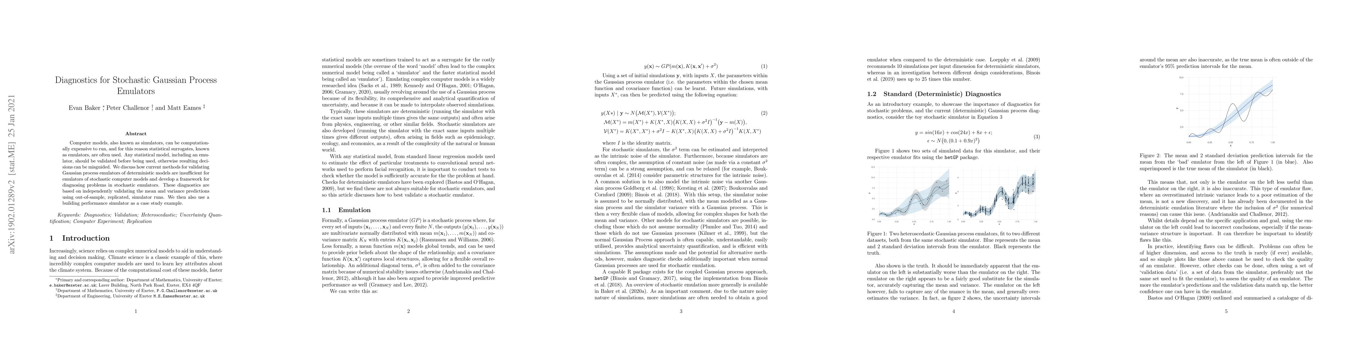 This paper develops a new framework for validating stochastic Gaussian process emulators used as surrogates for computationally expensive computer models. It addresses the inadequacies of current validation methods by introducing diagnostics based on out-of-sample, replicated simulator runs to independently validate mean and variance predictions.
