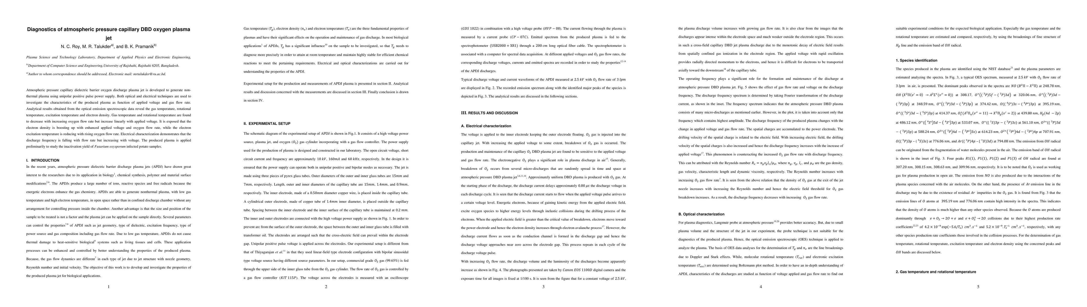 Atmospheric pressure capillary dielectric barrier oxygen discharge plasma jet is developed to generate non-thermal plasma using unipolar positive pulse power supply. Both optical and electrical techniques are used to investigate the characteristics of the produced plasma as function of applied voltage and gas flow rate. Analytical results obtained from the optical emission spectroscopic data reveal the gas temperature, rotational temperature, excitation temperature and electron density. Gas temperature and rotational temperature are found to decrease with increasing oxygen flow rate but increase linearly with applied voltage. It is exposed that the electron density is boosting up with enhanced applied voltage and oxygen flow rate, while the electron excitation temperature is reducing with rising oxygen flow rate. Electrical characterization demonstrates that the discharge frequency is falling with flow rate but increasing with voltage. The produced plasma is applied preliminarily to study the inactivation yield of Fusarium oxysporum infected potato samples.
