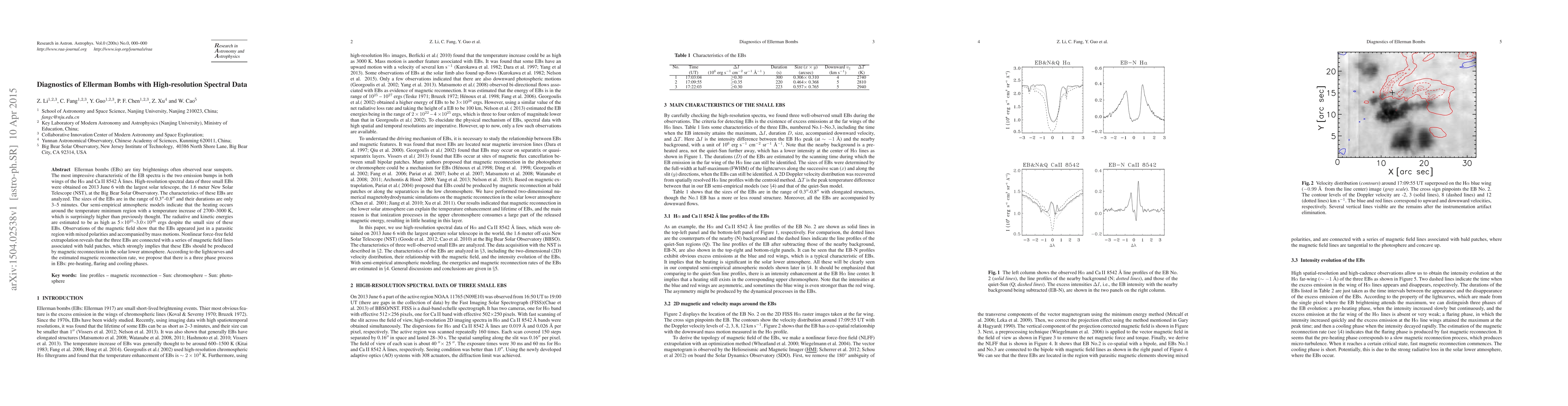 This paper analyzes high-resolution spectral data of three Ellerman bombs (EBs) observed with the New Solar Telescope, revealing sizes of 0.3\arcsec\--0.8\arcsec\ and durations of 3--5 minutes. The study finds that EBs are heated to a higher temperature than previously thought, suggesting a three-phase process: pre-heating, flaring, and cooling, likely driven by magnetic reconnection.