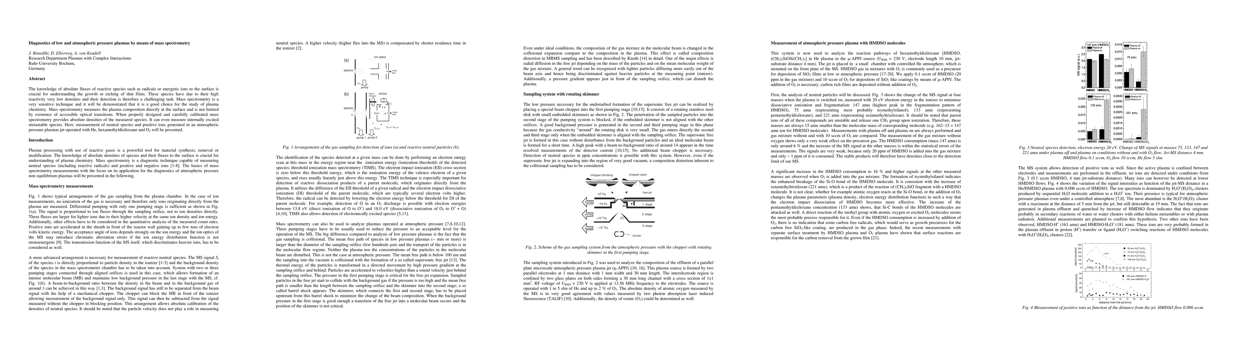 This paper demonstrates the use of mass spectrometry for diagnosing low and atmospheric pressure plasmas, highlighting its capability to measure the absolute fluxes of reactive species directly at the surface. The technique is shown to provide precise densities of neutral species and positive ions in plasmas generated by He, hexamethyldisiloxane, and O2.
