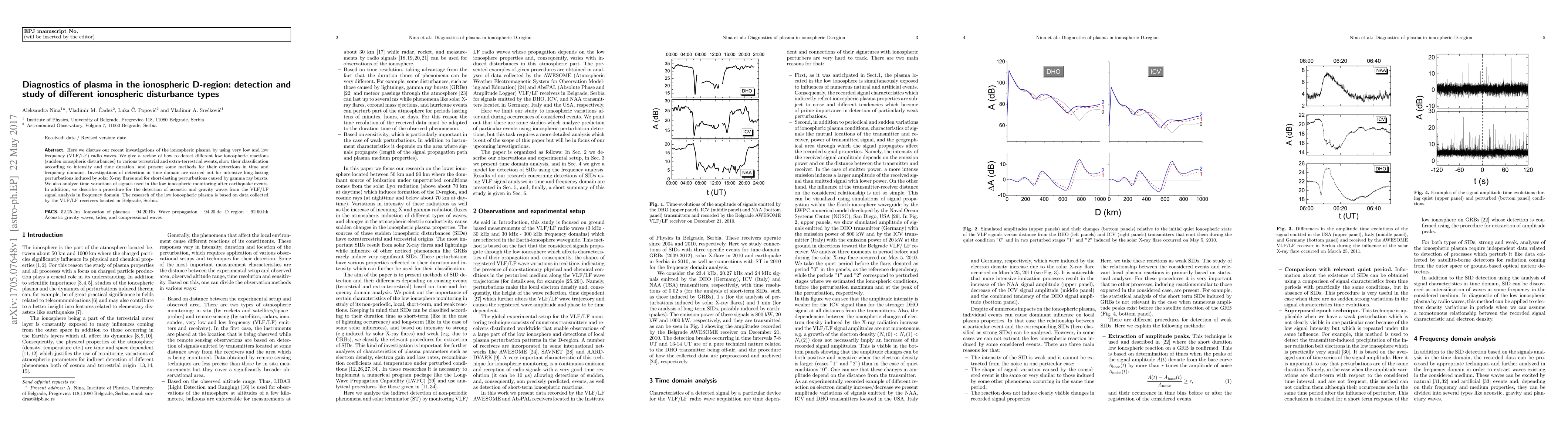 This paper reviews the use of VLF/LF radio waves to detect and study ionospheric disturbances in the D-region, including sudden perturbations from solar flares and gamma ray bursts, and signals from earthquake precursors. It also outlines methods for analyzing acoustic and gravity waves in the frequency domain.