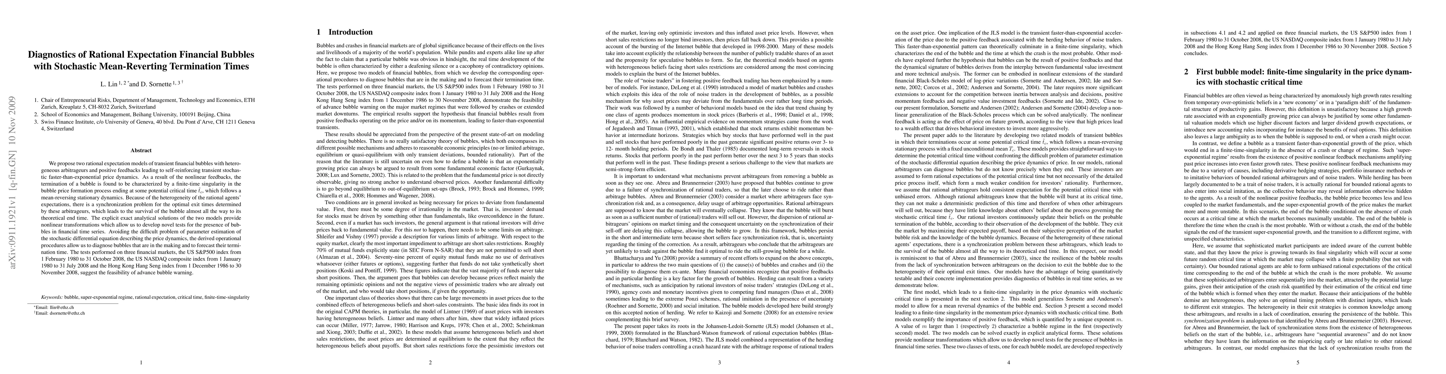 We propose two rational expectation models of transient financial bubbles with heterogeneous arbitrageurs and positive feedbacks leading to self-reinforcing transient stochastic faster-than-exponential price dynamics. As a result of the nonlinear feedbacks, the termination of a bubble is found to be characterized by a finite-time singularity in the bubble price formation process ending at some potential critical time $\tilde{t}_c$, which follows a mean-reversing stationary dynamics. Because of the heterogeneity of the rational agents' expectations, there is a synchronization problem for the optimal exit times determined by these arbitrageurs, which leads to the survival of the bubble almost all the way to its theoretical end time. The explicit exact analytical solutions of the two models provide nonlinear transformations which allow us to develop novel tests for the presence of bubbles in financial time series. Avoiding the difficult problem of parameter estimation of the stochastic differential equation describing the price dynamics, the derived operational procedures allow us to diagnose bubbles that are in the making and to forecast their termination time. The tests performed on three financial markets, the US S&P500 index from 1 February 1980 to 31 October 2008, the US NASDAQ composite index from 1 January 1980 to 31 July 2008 and the Hong Kong Hang Seng index from 1 December 1986 to 30 November 2008, suggest the feasibility of advance bubble warning.