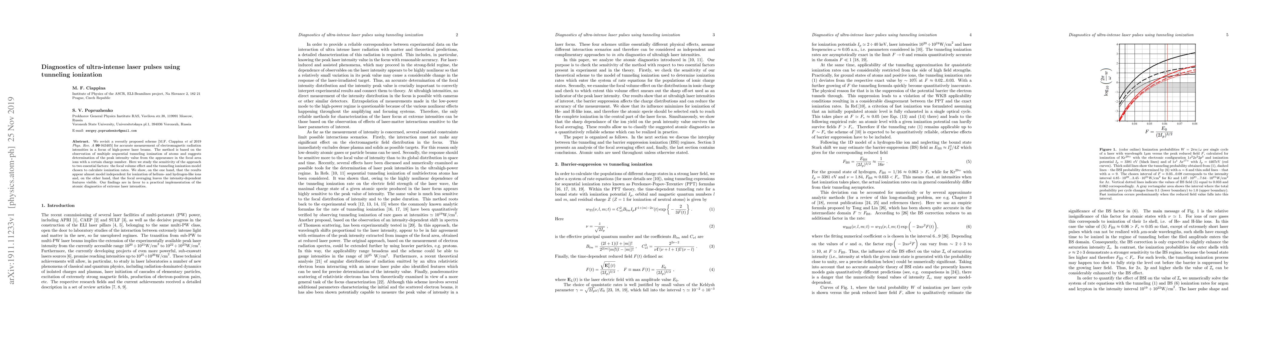 This paper revisits a method for measuring ultra-intense laser pulse intensities using tunneling ionization, demonstrating that the approach is robust against model variations and focal volume effects. The findings suggest practical implementation for diagnosing extreme laser intensities through sequential ionization of helium- and hydrogen-like ions.