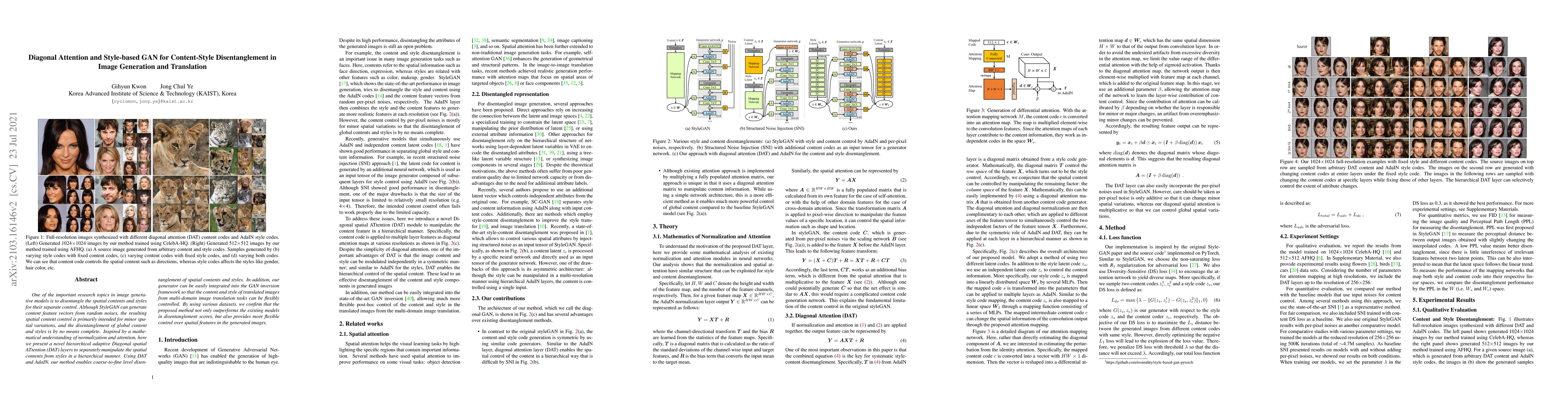 One of the important research topics in image generative models is to disentangle the spatial contents and styles for their separate control. Although StyleGAN can generate content feature vectors from random noises, the resulting spatial content control is primarily intended for minor spatial variations, and the disentanglement of global content and styles is by no means complete. Inspired by a mathematical understanding of normalization and attention, here we present a novel hierarchical adaptive Diagonal spatial ATtention (DAT) layers to separately manipulate the spatial contents from styles in a hierarchical manner. Using DAT and AdaIN, our method enables coarse-to-fine level disentanglement of spatial contents and styles. In addition, our generator can be easily integrated into the GAN inversion framework so that the content and style of translated images from multi-domain image translation tasks can be flexibly controlled. By using various datasets, we confirm that the proposed method not only outperforms the existing models in disentanglement scores, but also provides more flexible control over spatial features in the generated images.