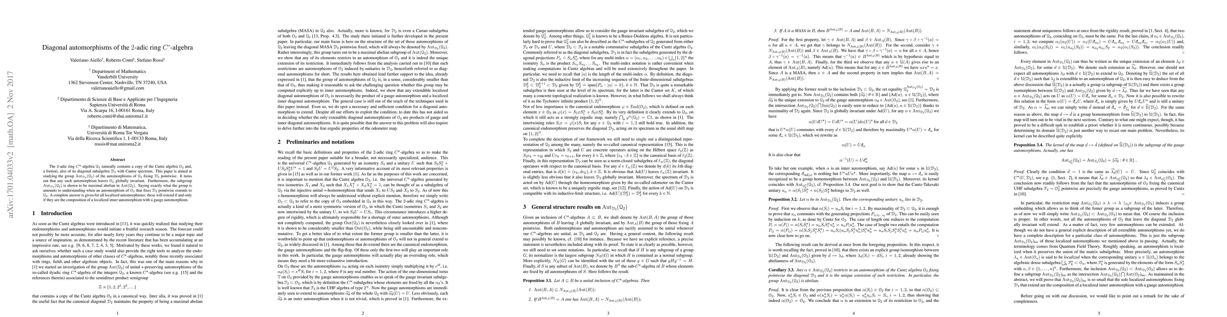 The $2$-adic ring $C^*$-algebra $\mathcal{Q}_2$ naturally contains a copy of the Cuntz algebra $\mathcal{O}_2$ and, a fortiori, also of its diagonal subalgebra $\mathcal{D}_2$ with Cantor spectrum. This paper is aimed at studying the group ${\rm Aut}_{\mathcal{D}_2}(\mathcal{Q}_2)$ of the automorphisms of $\mathcal{Q}_2$ fixing $\mathcal{D}_2$ pointwise. It turns out that any such automorphism leaves $\mathcal{O}_2$ globally invariant. Furthermore, the subgroup ${\rm Aut}_{\mathcal{D}_2}(\mathcal{Q}_2)$ is shown to be maximal abelian in ${\rm Aut}(\mathcal{Q}_2)$. Saying exactly what the group is amounts to understanding when an automorphism of $\mathcal{O}_2$ that fixes $\mathcal{D}_2$ pointwise extends to $\mathcal{Q}_2$. A complete answer is given for all localized automorphisms: these will extend if and only if they are the composition of a localized inner automorphism with a gauge automorphism.
