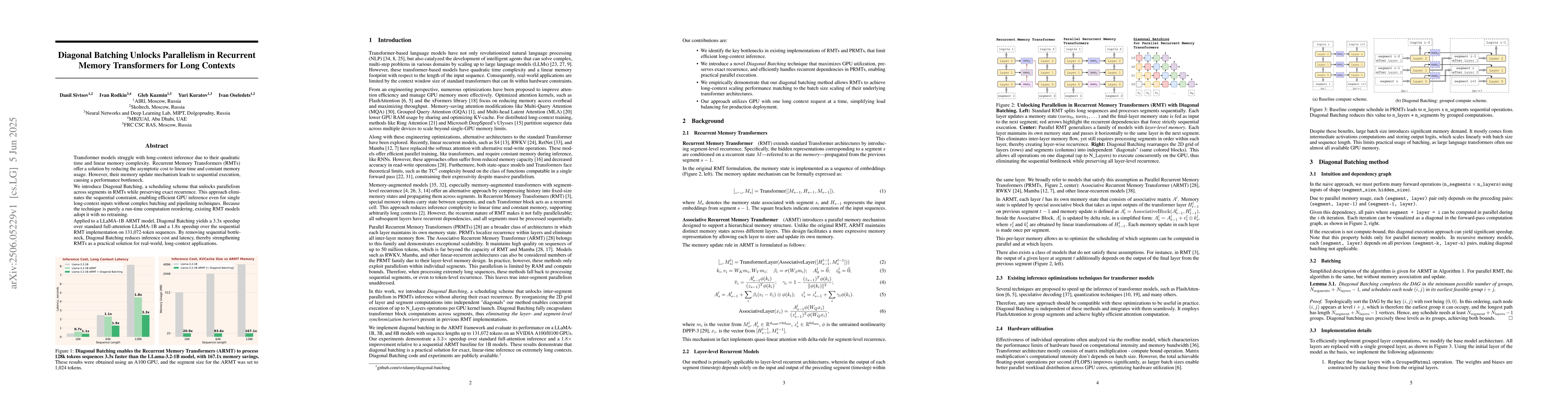 Researchers introduced Diagonal Batching to unlock parallelism in Recurrent Memory Transformers, achieving a 3.3x speedup over full-attention models and 1.8x speedup over sequential RMTs for long-context inputs.