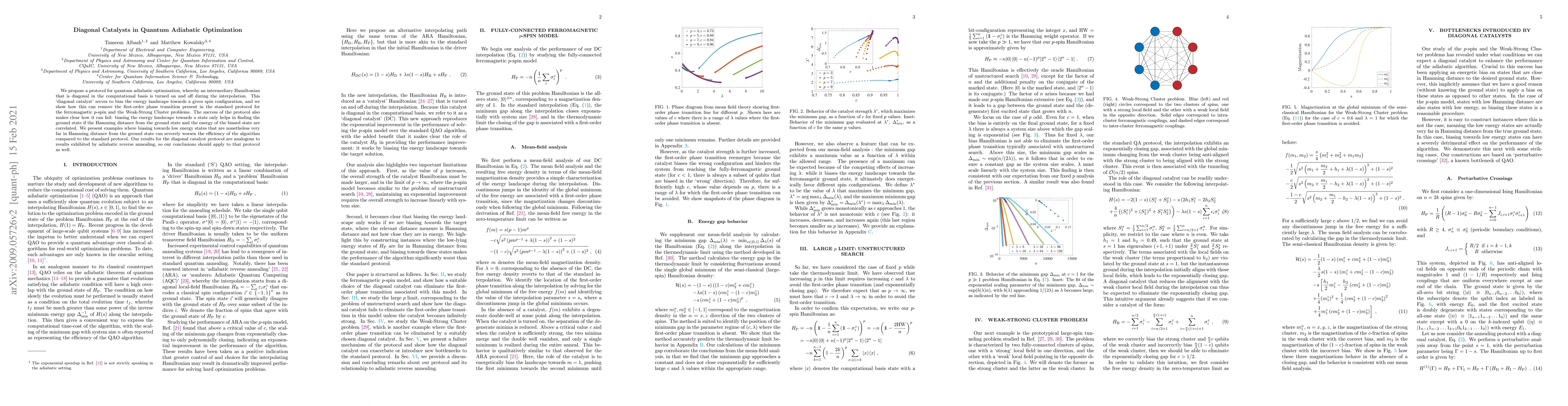 This paper proposes a "diagonal catalyst" protocol in quantum adiabatic optimization that uses an intermediary Hamiltonian to bias the energy landscape, effectively removing first-order phase transitions in certain problems. However, it warns that this approach can worsen efficiency if the biased state's energy is not correlated with the ground state's Hamming distance.