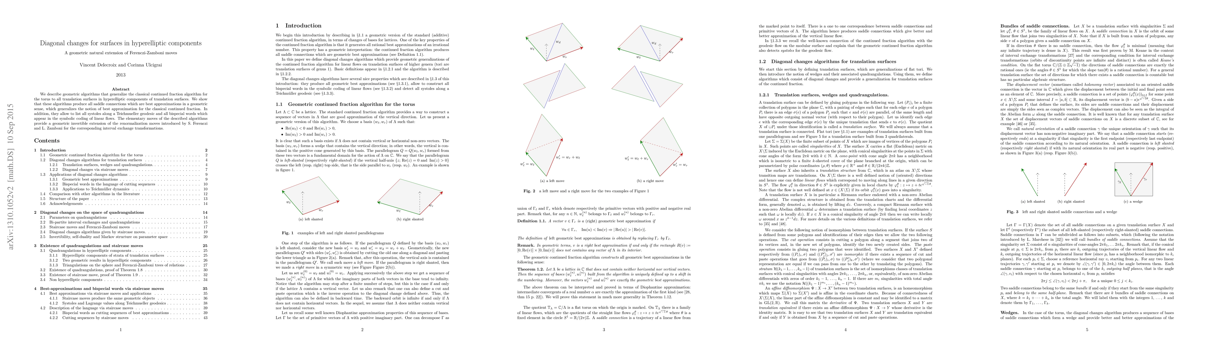 This paper presents geometric algorithms extending the classical continued fraction method to translation surfaces in hyperelliptic components, generating optimal saddle connections, listing all systoles along a Teichmueller geodesic, and identifying bispecial words in linear flow codings. These algorithms also offer a geometric invertible extension of renormalization moves for interval exchange transformations.