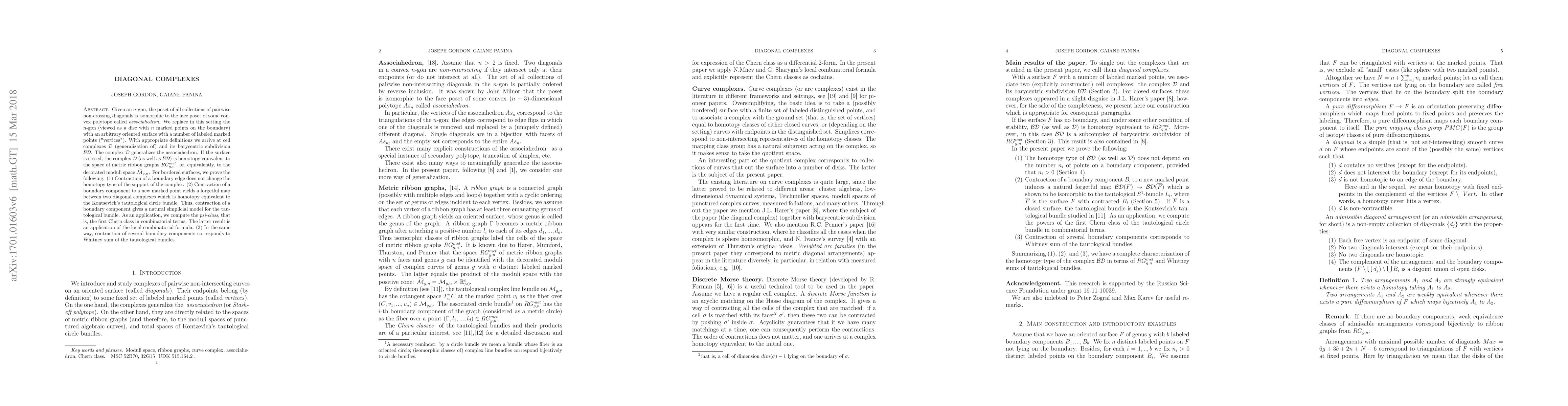 Given an $n$-gon, the poset of all collections of pairwise non-crossing diagonals is isomorphic to the face poset of some convex polytope called \textit{associahedron}. We replace in this setting the $n$-gon (viewed as a disc with $n$ marked points on the boundary) with an arbitrary oriented surface with a number of labeled marked points ("vertices"). With appropriate definitions we arrive at cell complexes $\mathcal{D}$ (generalization of) and its barycentric subdivision $\mathcal{BD}$. The complex $\mathcal{D}$ generalizes the associahedron. If the surface is closed, the complex $\mathcal{D}$ (as well as $\mathcal{BD}$) is homotopy equivalent to the space of metric ribbon graphs $RG_{g,n}^{met}$, or, equivalently, to the decorated moduli space $\widetilde{\mathcal{M}}_{g,n}$. For bordered surfaces, we prove the following: (1) Contraction of a boundary edge does not change the homotopy type of the support of the complex. (2) Contraction of a boundary component to a new marked point yields a forgetful map between two diagonal complexes which is homotopy equivalent to the Kontsevich's tautological circle bundle. Thus, contraction of a boundary component gives a natural simplicial model for the tautological bundle. As an application, we compute the psi-class, that is, the first Chern class in combinatorial terms. The latter result is an application of the local combinatorial formula. (3) In the same way, contraction of several boundary components corresponds to Whitney sum of the tautological bundles.