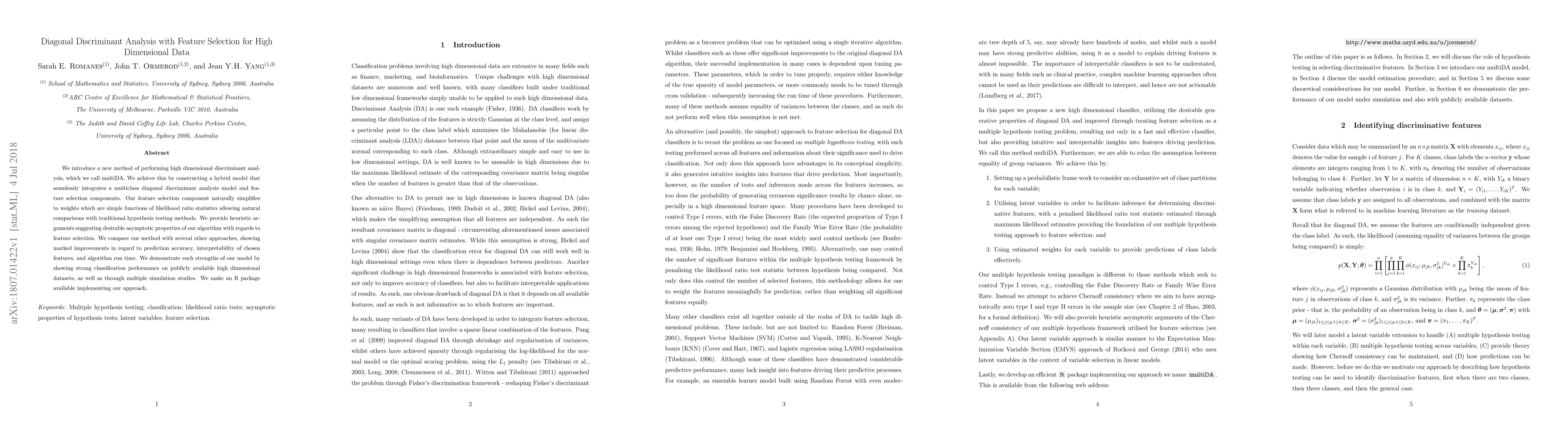 We introduce a new method of performing high dimensional discriminant analysis, which we call multiDA. We achieve this by constructing a hybrid model that seamlessly integrates a multiclass diagonal discriminant analysis model and feature selection components. Our feature selection component naturally simplifies to weights which are simple functions of likelihood ratio statistics allowing natural comparisons with traditional hypothesis testing methods. We provide heuristic arguments suggesting desirable asymptotic properties of our algorithm with regards to feature selection. We compare our method with several other approaches, showing marked improvements in regard to prediction accuracy, interpretability of chosen features, and algorithm run time. We demonstrate such strengths of our model by showing strong classification performance on publicly available high dimensional datasets, as well as through multiple simulation studies. We make an R package available implementing our approach.