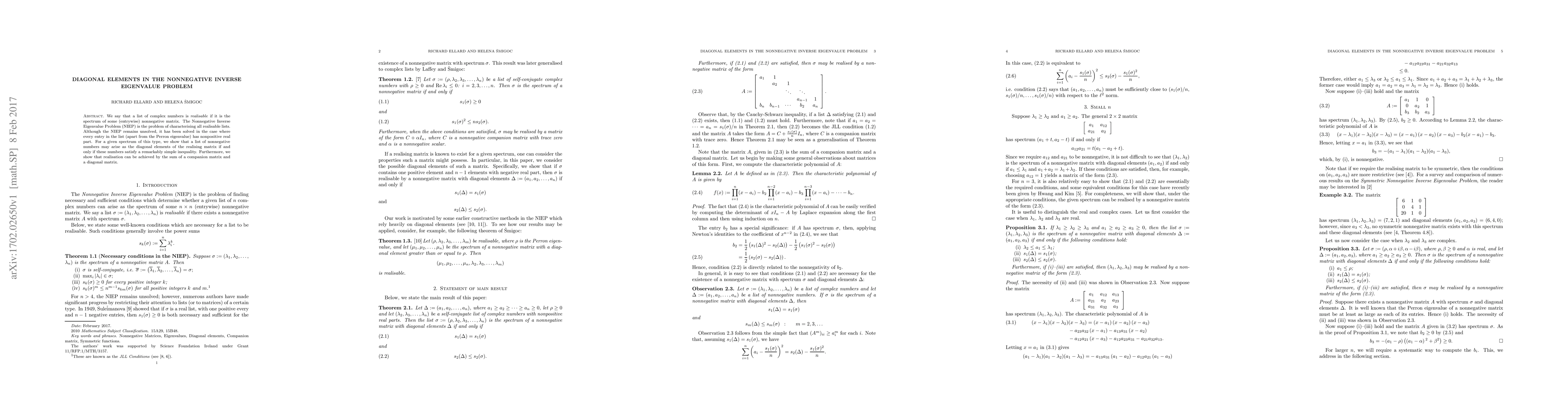 We say that a list of complex numbers is "realisable" if it is the spectrum of some (entrywise) nonnegative matrix. The Nonnegative Inverse Eigenvalue Problem (NIEP) is the problem of characterising all realisable lists. Although the NIEP remains unsolved, it has been solved in the case where every entry in the list (apart from the Perron eigenvalue) has nonpositive real part. For a given spectrum of this type, we show that a list of nonnegative numbers may arise as the diagonal elements of the realising matrix if and only if these numbers satisfy a remarkably simple inequality. Furthermore, we show that realisation can be achieved by the sum of a companion matrix and a diagonal matrix.