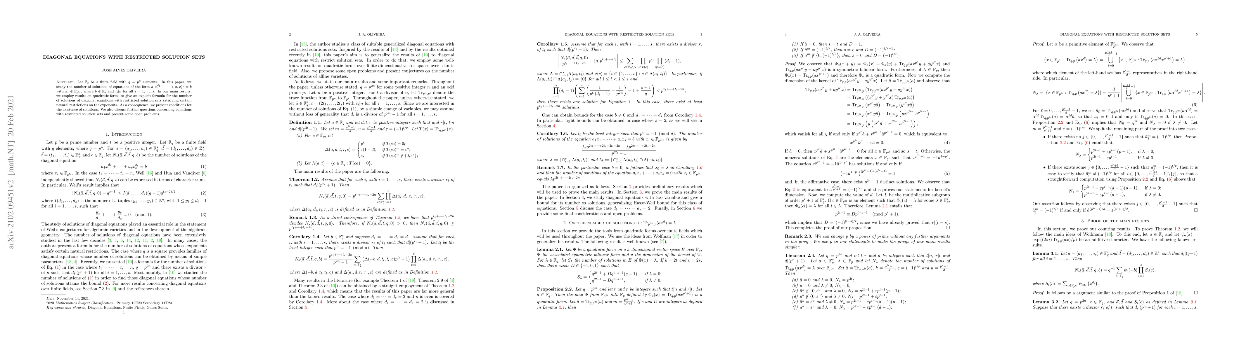 This paper studies equations with restricted solution sets in finite fields, providing an explicit formula for diagonal equations under certain conditions and discussing existence of solutions.