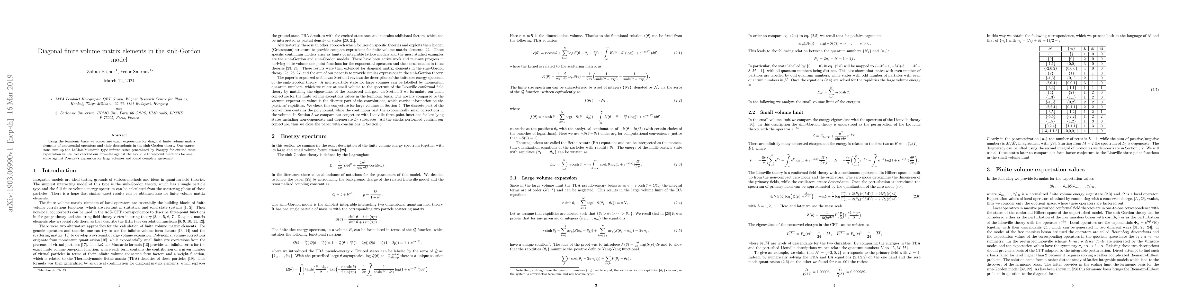 This paper proposes exact expressions for diagonal finite volume matrix elements in the sinh-Gordon model using a fermionic basis, confirming these expressions through agreement with Liouville three-point functions and Pozsgay's expansion.