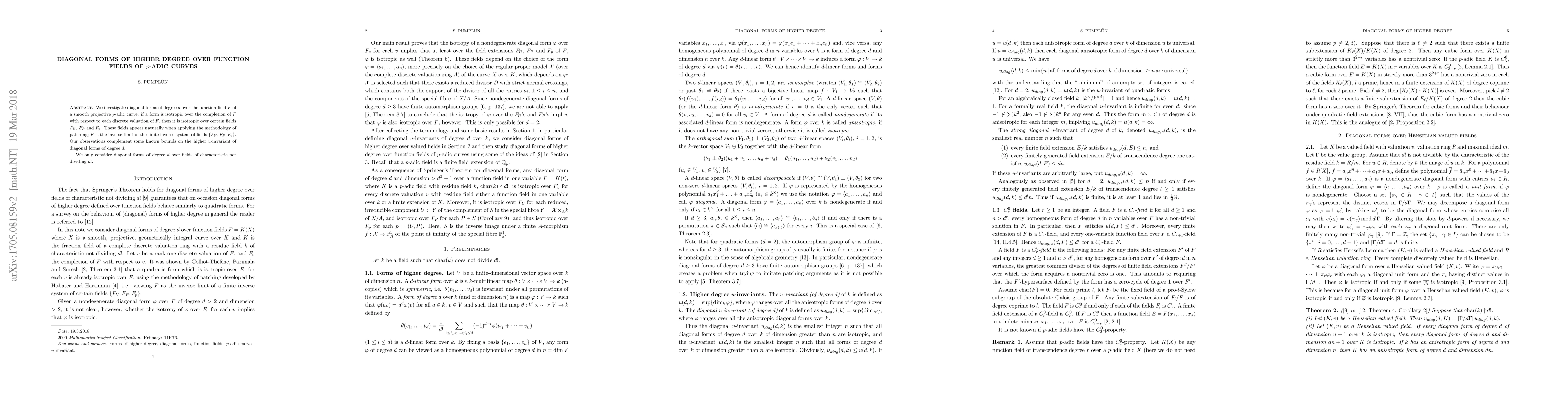 We investigate diagonal forms of degree $d$ over the function field $F$ of a smooth projective $p$-adic curve: if a form is isotropic over the completion of $F$ with respect to each discrete valuation of $F$, then it is isotropic over certain fields $F_U$, $F_P$ and $F_p$. These fields appear naturally when applying the methodology of patching; $F$ is the inverse limit of the finite inverse system of fields $\{F_U,F_P,F_p\}$. Our observations complement some known bounds on the higher $u$-invariant of diagonal forms of degree $d$. We only consider diagonal forms of degree $d$ over fields of characteristic not dividing $d!$.