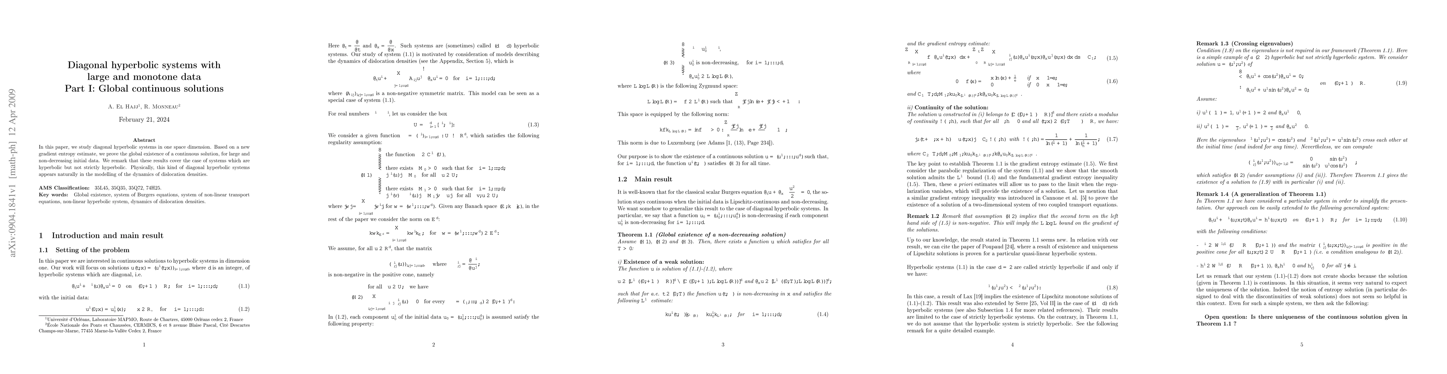 In this paper, we study diagonal hyperbolic systems in one space dimension. Based on a new gradient entropy estimate, we prove the global existence of a continuous solution, for large and non-decreasing initial data. We remark that these results cover the case of systems which are hyperbolic but not strictly hyperbolic. Physically, this kind of diagonal hyperbolic systems appears naturally in the modelling of the dynamics of dislocation densities.