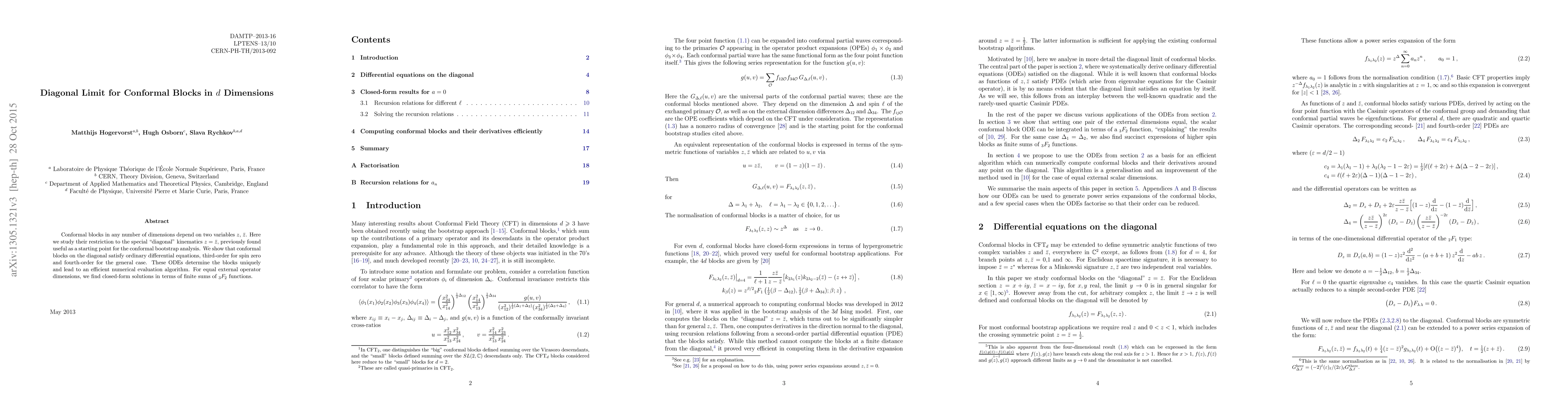 The paper derives ordinary differential equations (ODEs) satisfied by conformal blocks on the diagonal z = z̄ in any number of dimensions, proposes an efficient numerical evaluation algorithm for conformal blocks and their derivatives around any point on the diagonal, and provides closed-form representations for conformal blocks on the diagonal in terms of 3F2 functions for the case of equal external operator dimensions.