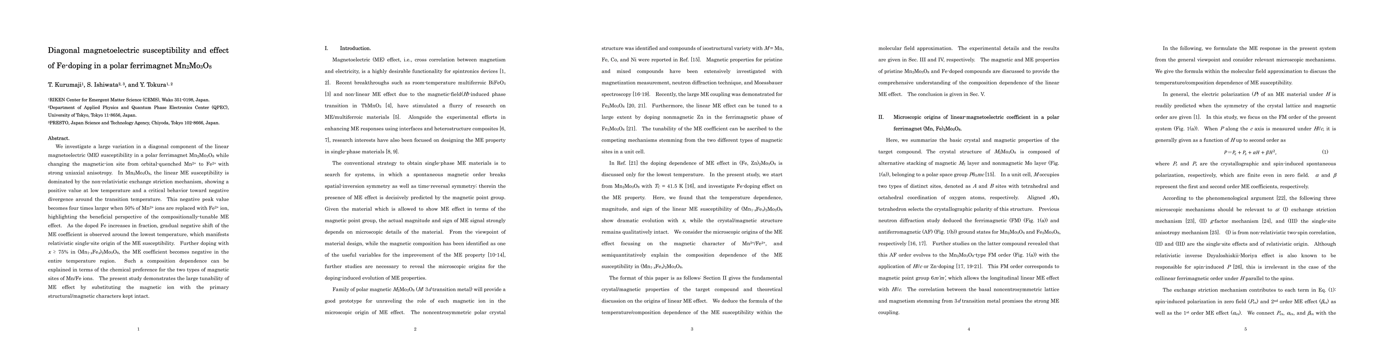 Researchers investigated the effect of Fe-doping on a polar ferrimagnet Mn2Mo3O8, showing significant tunability in its diagonal magnetoelectric susceptibility, which becomes four times larger when half of the Mn ions are replaced with Fe.