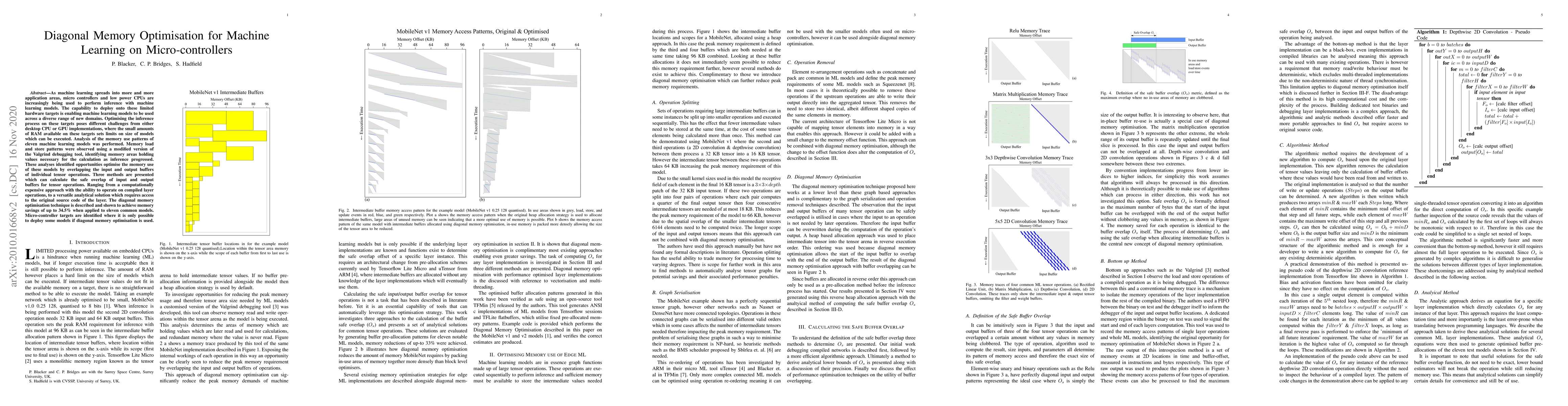 As machine learning spreads into more and more application areas, micro controllers and low power CPUs are increasingly being used to perform inference with machine learning models. The capability to deploy onto these limited hardware targets is enabling machine learning models to be used across a diverse range of new domains. Optimising the inference process on these targets poses different challenges from either desktop CPU or GPU implementations, where the small amounts of RAM available on these targets sets limits on size of models which can be executed. Analysis of the memory use patterns of eleven machine learning models was performed. Memory load and store patterns were observed using a modified version of the Valgrind debugging tool, identifying memory areas holding values necessary for the calculation as inference progressed. These analyses identified opportunities optimise the memory use of these models by overlapping the input and output buffers of individual tensor operations. Three methods are presented which can calculate the safe overlap of input and output buffers for tensor operations. Ranging from a computationally expensive approach with the ability to operate on compiled layer operations, to a versatile analytical solution which requires access to the original source code of the layer. The diagonal memory optimisation technique is described and shown to achieve memory savings of up to 34.5% when applied to eleven common models. Micro-controller targets are identified where it is only possible to deploy some models if diagonal memory optimisation is used.