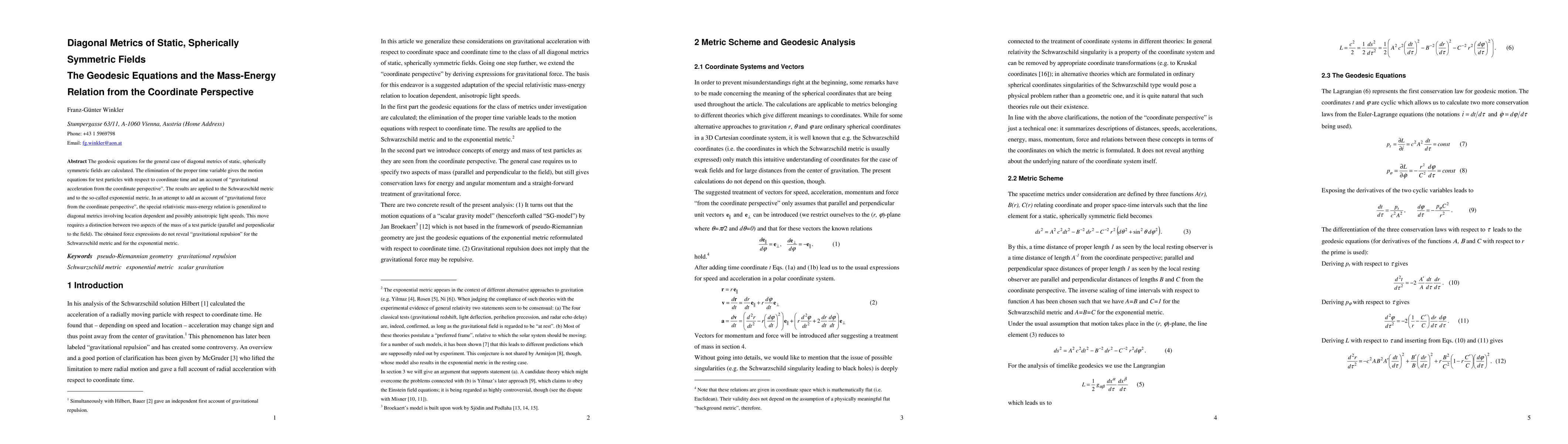 This paper derives geodesic equations for diagonal metrics of static, spherically symmetric fields, applying them to the Schwarzschild and exponential metrics. It generalizes the special relativistic mass-energy relation to account for gravitational force from a coordinate perspective, distinguishing between parallel and perpendicular mass components.