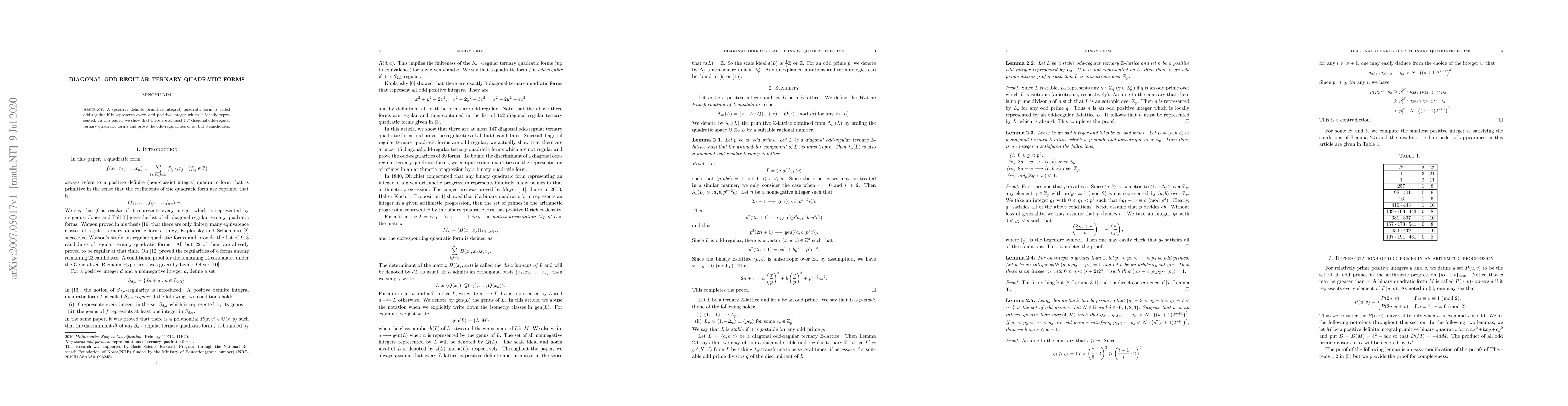 Summary: This paper investigates diagonal odd-regular ternary quadratic forms, proving that there are at most 147 such forms and confirming the odd-regularity of all but 6 candidates. The remaining 6 forms require further investigation to determine their properties.