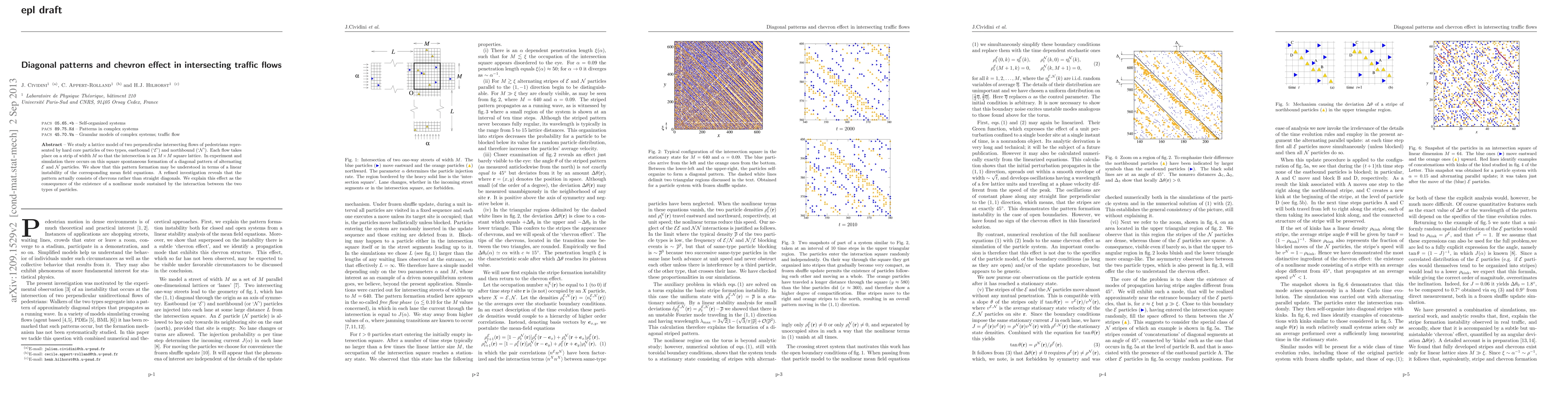 This research explores a lattice model of intersecting pedestrian flows, revealing spontaneous diagonal pattern formation due to linear instability in mean field equations. The patterns are actually chevrons, explained by a nonlinear mode resulting from interactions between different pedestrian types.