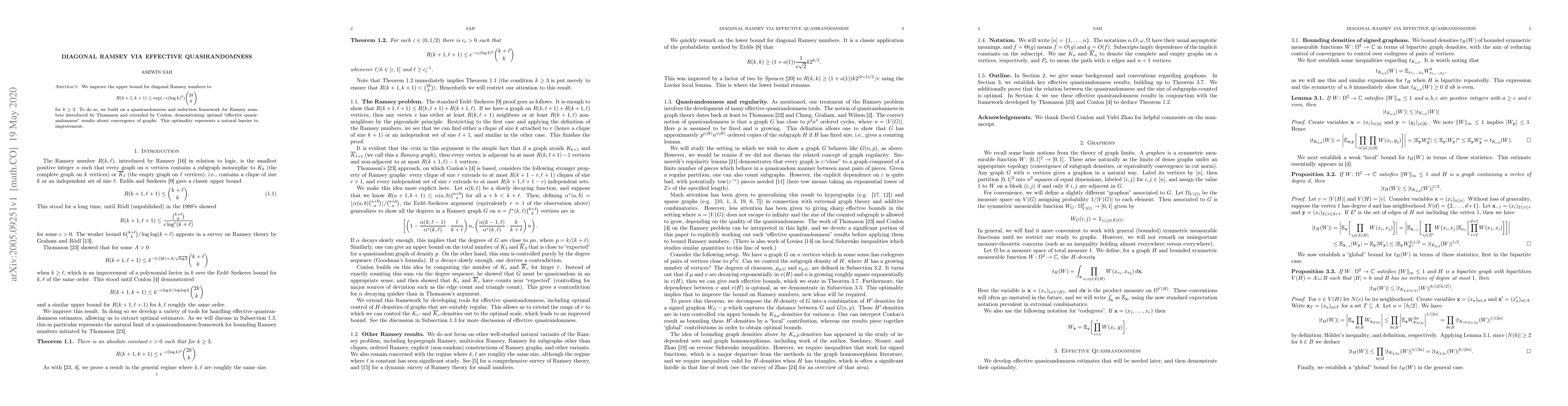 This paper improves the upper bound for diagonal Ramsey numbers using effective quasirandomness, showing that \(R(k+1,k+1) \le \exp(-c(\log k)^2)\binom{2k}{k}\) for \(k \ge 3\). It leverages a quasirandomness framework introduced by Thomason and extended by Conlon to achieve optimal results.