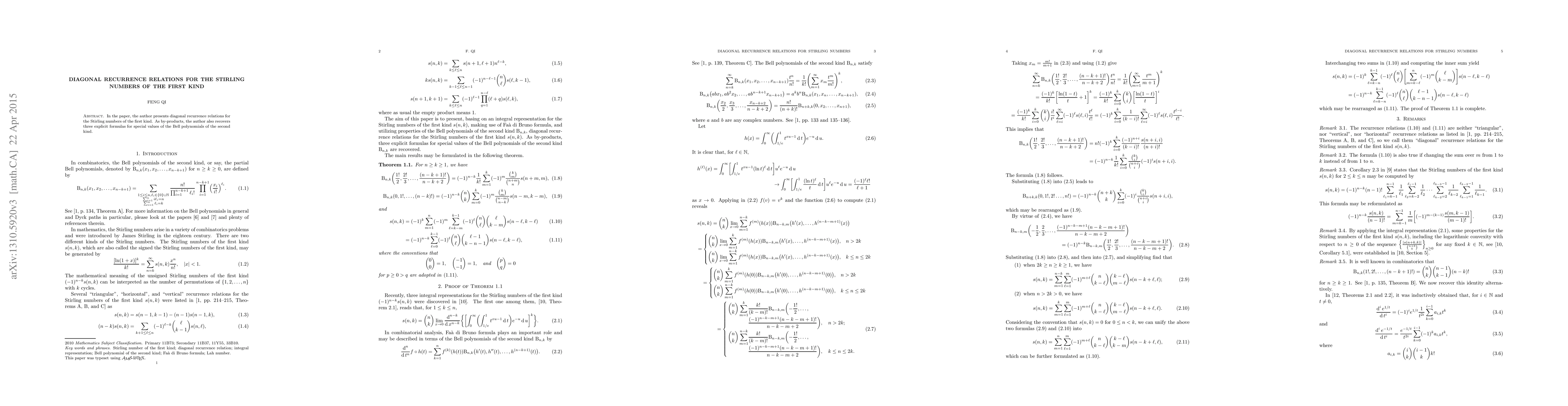 Researchers found diagonal recurrence relations for Stirling numbers of the first kind, which also led to recovery of explicit formulas for special Bell polynomials values.