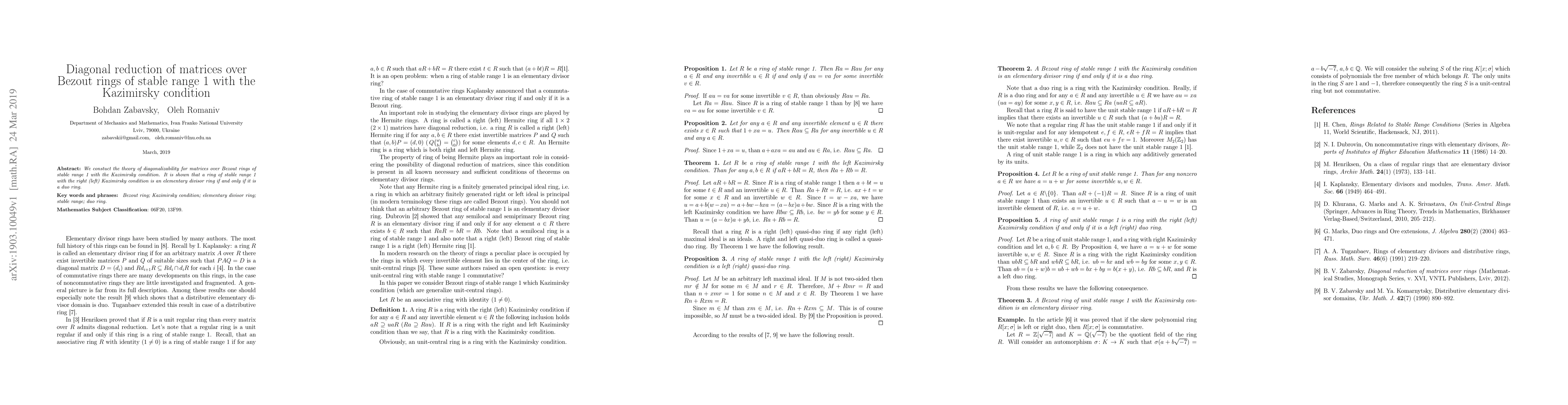 We constuct the theory of diagonalizability for matrices over Bezout rings of stable range 1 with the Kazimirsky condition. It is shown that a ring of stable range 1 with the right (left) Kazimirsky condition is an elementary divisor ring if and only if it is a duo ring.