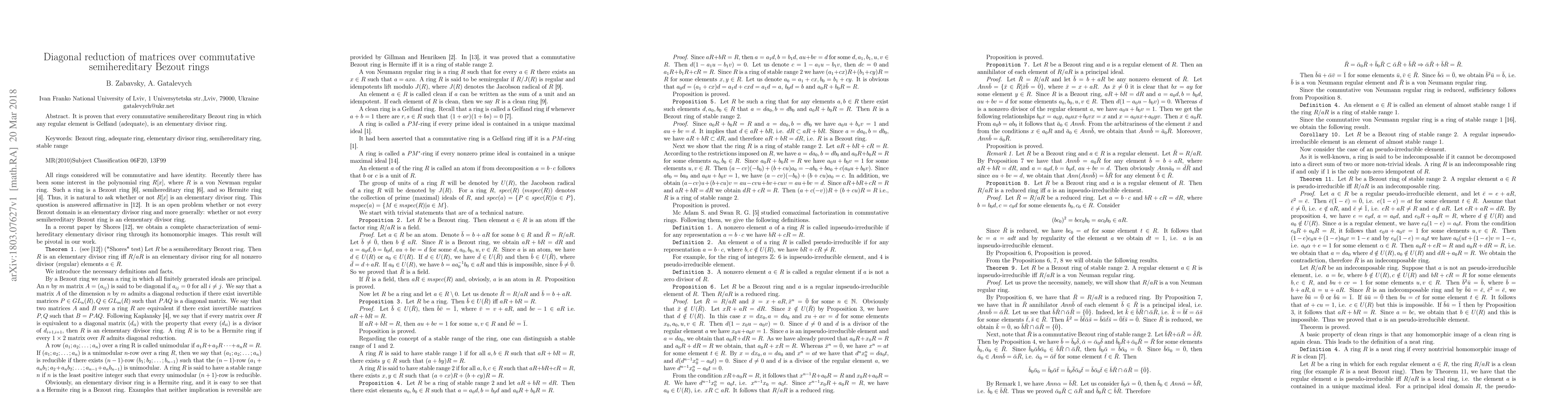 This paper proves that commutative semihereditary Bezout rings, where any regular element is Gelfand (adequate), are elementary divisor rings, establishing a diagonal reduction property for matrices over such rings.